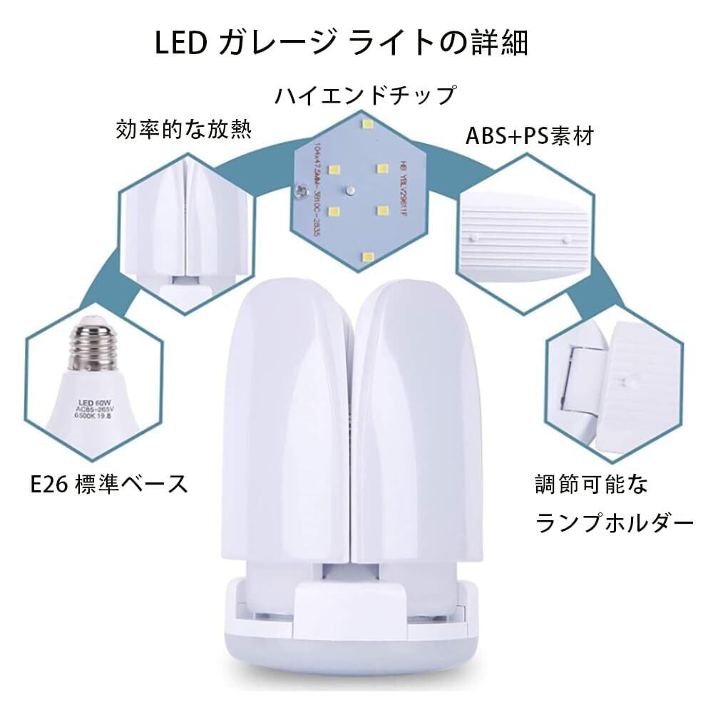 ガレージ 照明 60W ガレージライト led:5灯式の高輝度LEDパネル、合計156個の高輝度LEDランプビーズを備えている。LED 照明器具を使用し、80%の省エネ、環境に優しく、費用効果が高い。ガレージライトは、作業時に6000ルーメンを出力します。口金:E26 定格電圧:AC85-265V 定格電流:500mA/1000mA 消費電力:80W ルーメン:6000lm ライト色:昼白色 演色性:>80