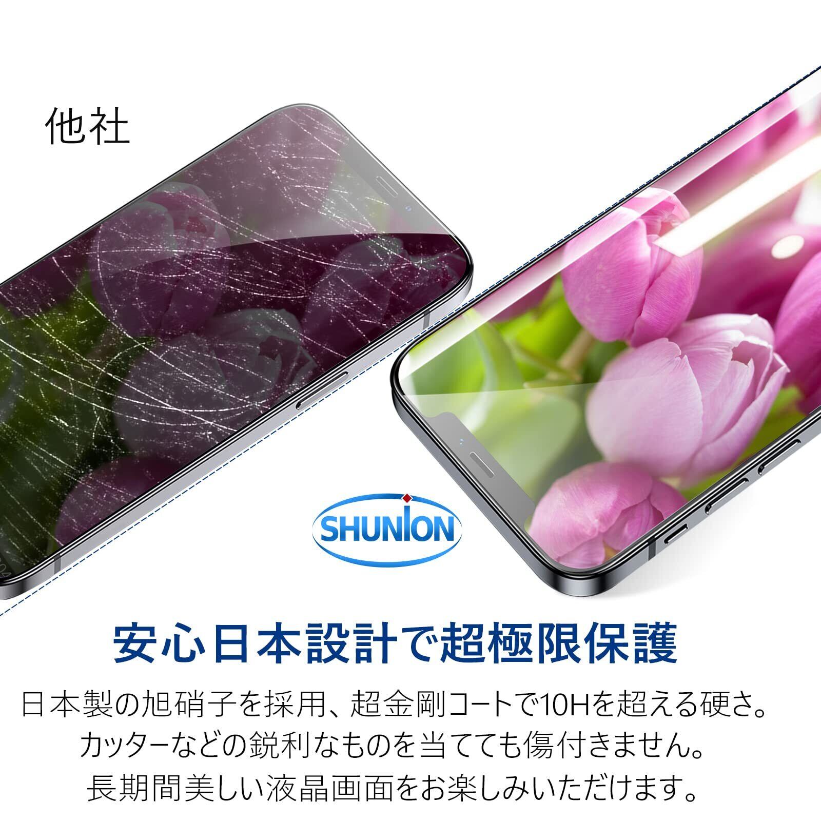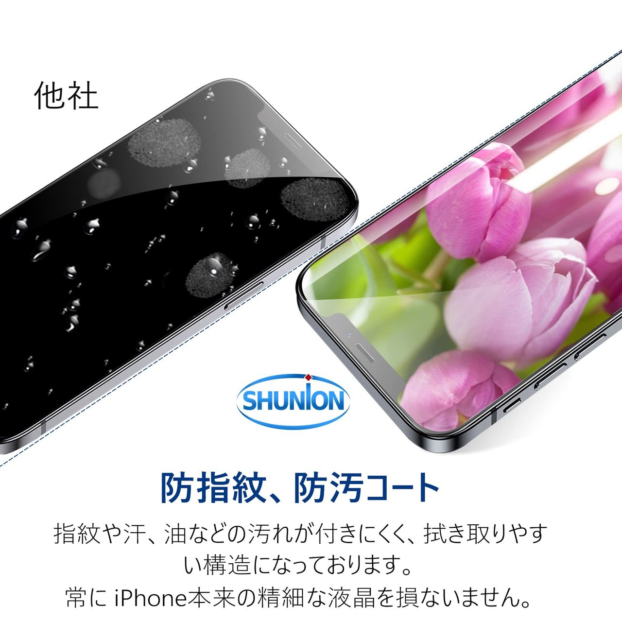 【透明度拔群!撥水撥油、指紋防止】:SHUNIONのいphone12 強化ガラスフィルム 高透過率で、iPhone元々の画質が損なわず、付いていることを忘れるくらい透明度をもっています。更に、蒸着材料を加熱し昇華して、フィルムの表面に疎油性の指紋防止コーティングを形成します。従来の保護ガラスフィルムより汚れ防止効果は3倍長く持続し、付着した汚れも簡単に拭き取ることができます。