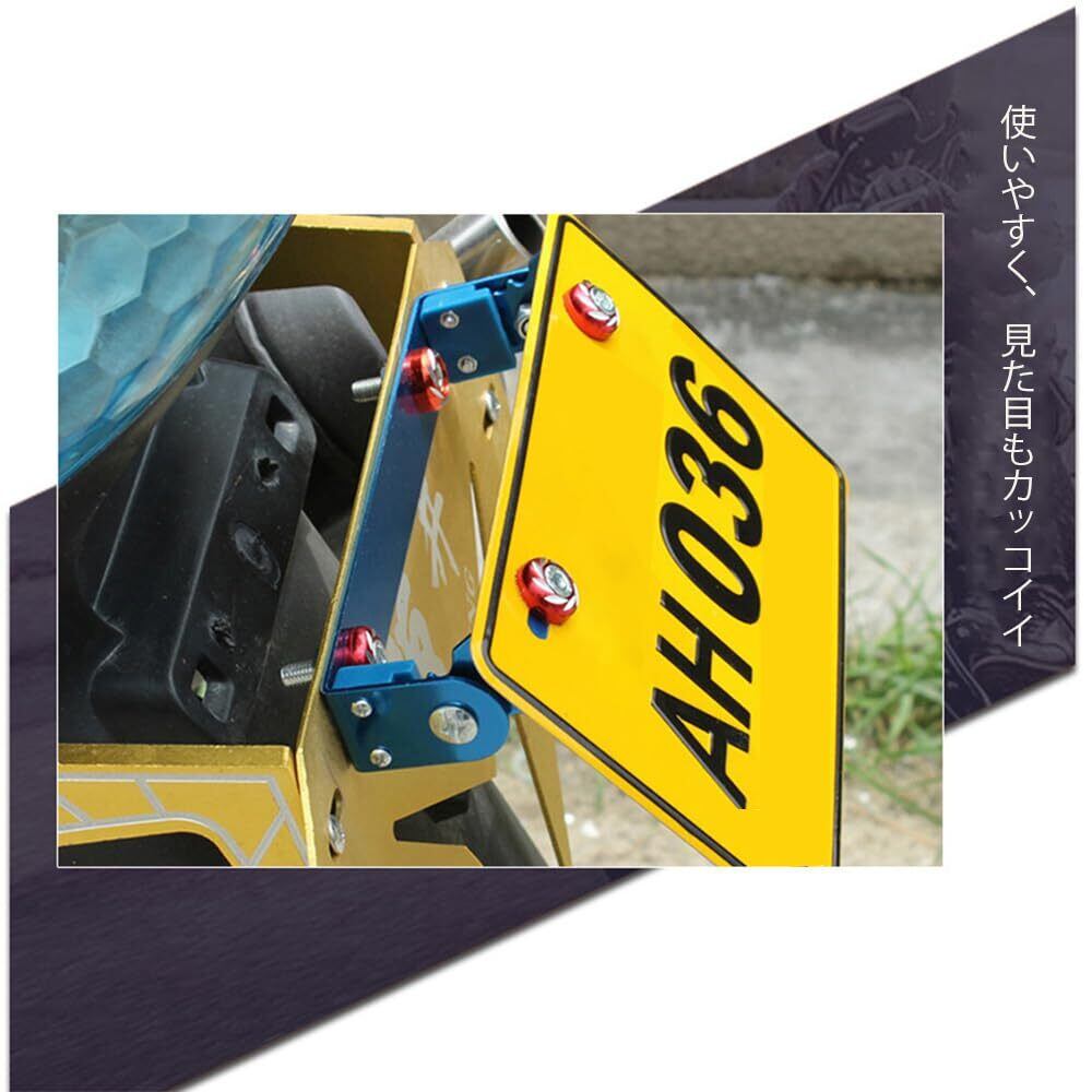 "1.【適用機種】原付から中型・大型バイクまで、ほとんどのバイクに対応し、車の外観をカッコよく変えます。 2.【簡単な操作】:取り付けスパナを使用するために、追加の工具は必要ありません。また、ネジの色をナンバープレート固定アームと同じにすることで、より美しい仕上がりになっています。 3.【調整範囲】:手動調整により、ナンバープレートホルダーは+90度から-90度まで、180度(30度間隔)の範囲で調整可能です。 4.【パッケージ内容】:ナンバープレートホルダー1個、6mm六角取付ネジ4セット、6mm六角スパナ1セット。 5.【材質・サイズ】:アルミニウム合金製、サイズ17.5cm x 5cm x 2.3cm