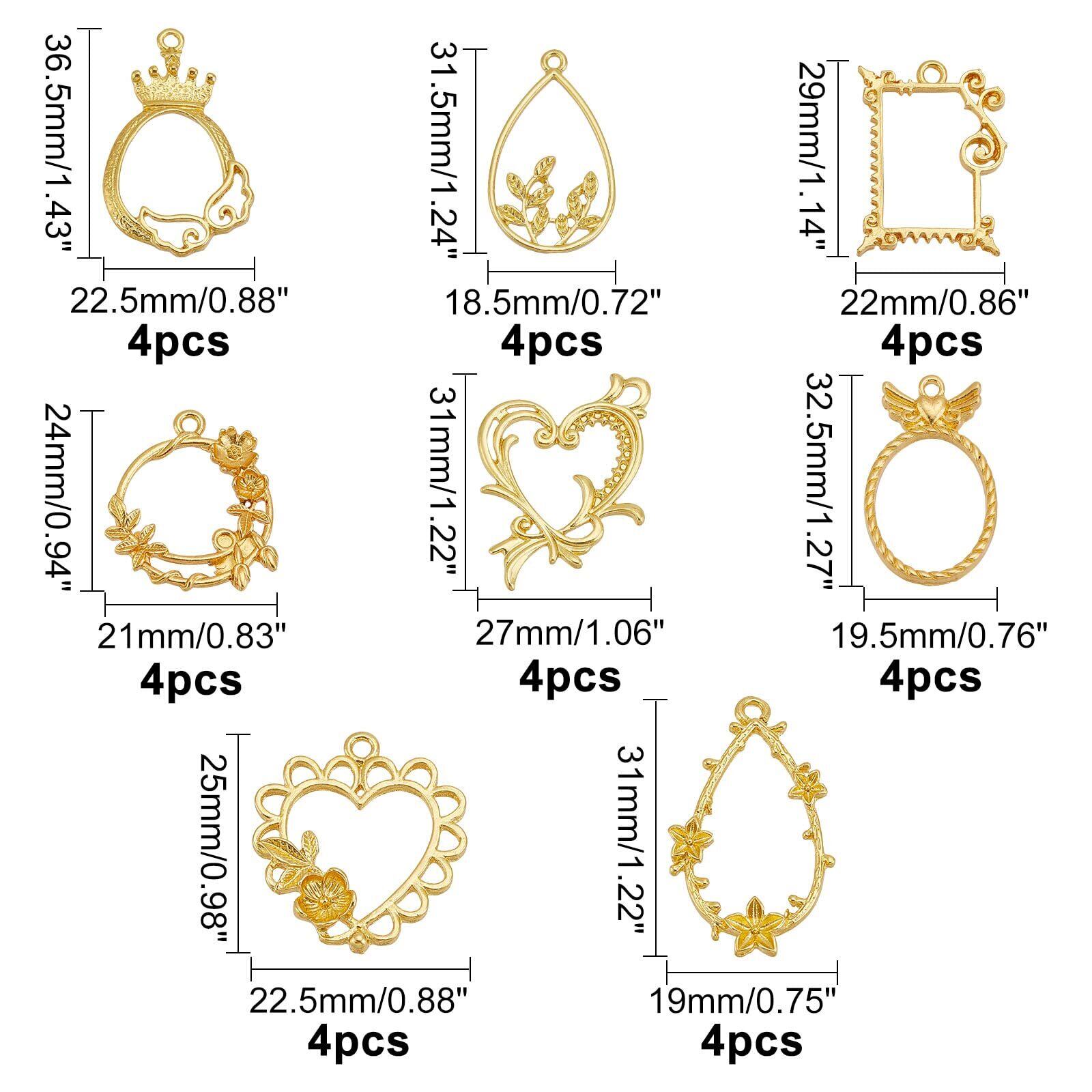 【パッケージ内容】パッケージには、花、ハートなどのモチーフのレジン空枠が8種類、4個/種類、合計32個があります。(サイズ詳細は写真を参照してください。)