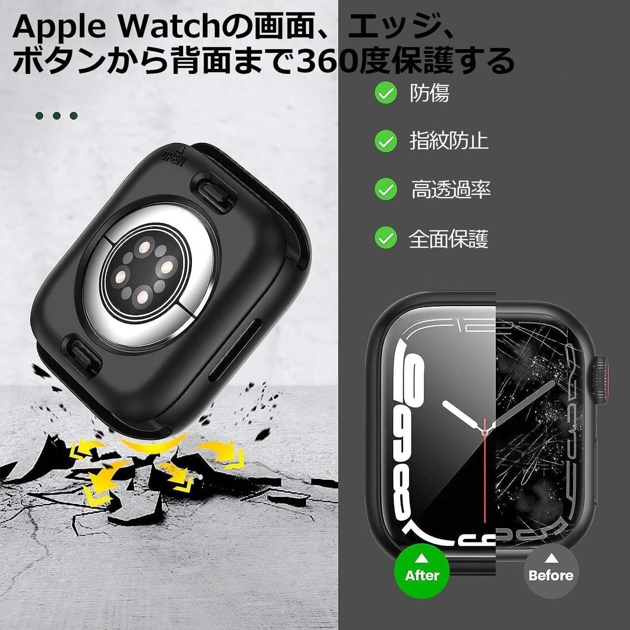 【液晶保護フィルム+保護ケース+背面保護ケースの3 in 1設計】本製品は、Apple Watchの画面、エッジ、ボタンから背面まで360度保護する、Apple Watchケース/フィルム一体型の保護ケース+背面保護ケースの3つの合体設計です。11H硬度の強化ガラスフィルムは、キズに強く耐久性があり、高解像度で高透過率、タッチもスムーズです。PC素材の保護ケースは、落下やキズなどからあなたのApple Watchを保護し、新品の状態を長持ちさせます。