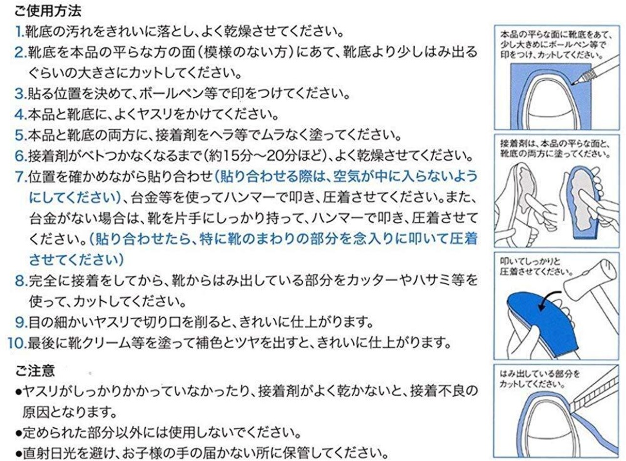 注意:靴の大きさデザインによっては、本製品1枚で左右足分を補うことが出来ない場合は、2枚セット品もご用意しておりますので、こちららでご検討下さい。 靴修理キット NAシート【2枚セット】⇒ https://www.amazon.co.jp/dp/B07MC7LLW7?ref=myi_title_dp