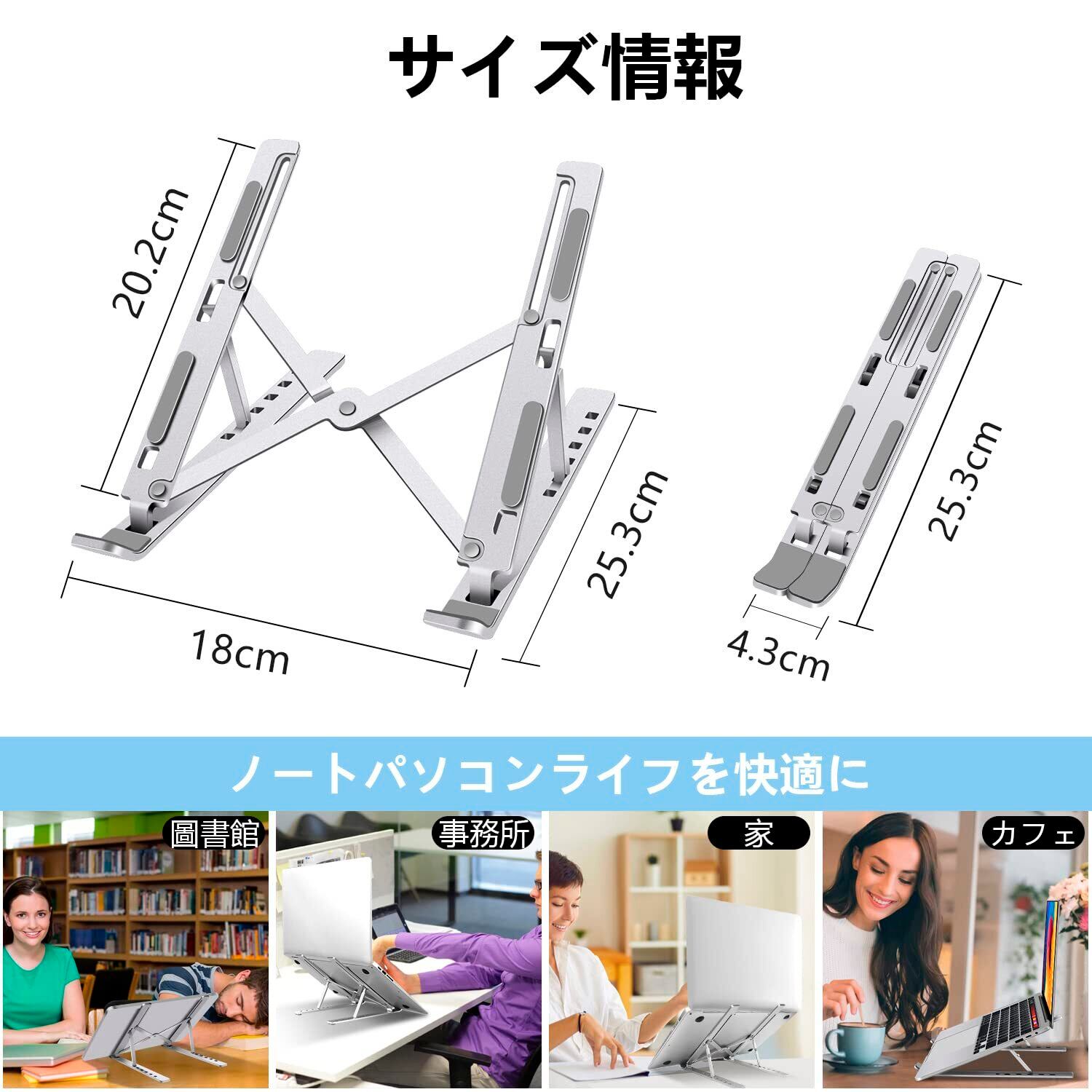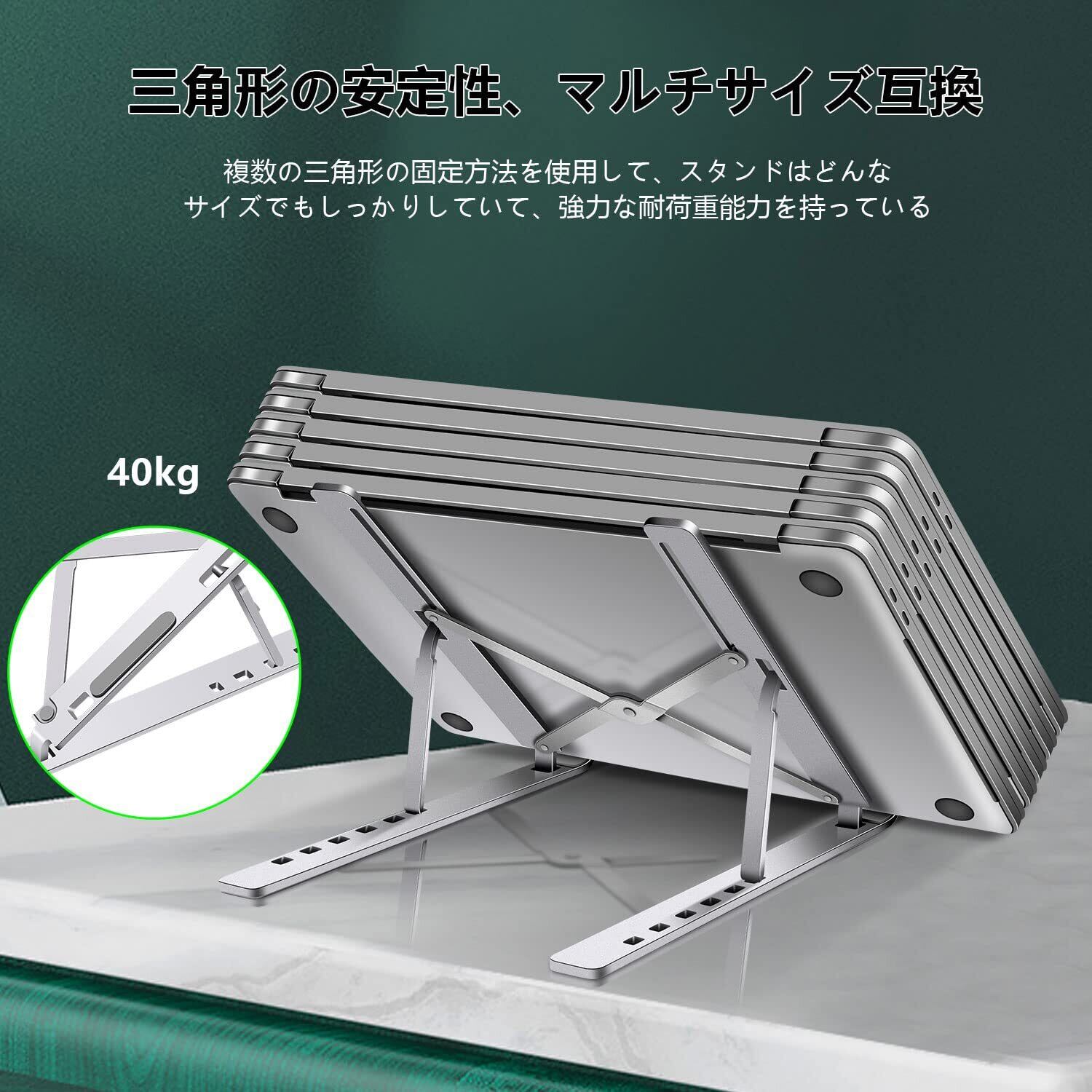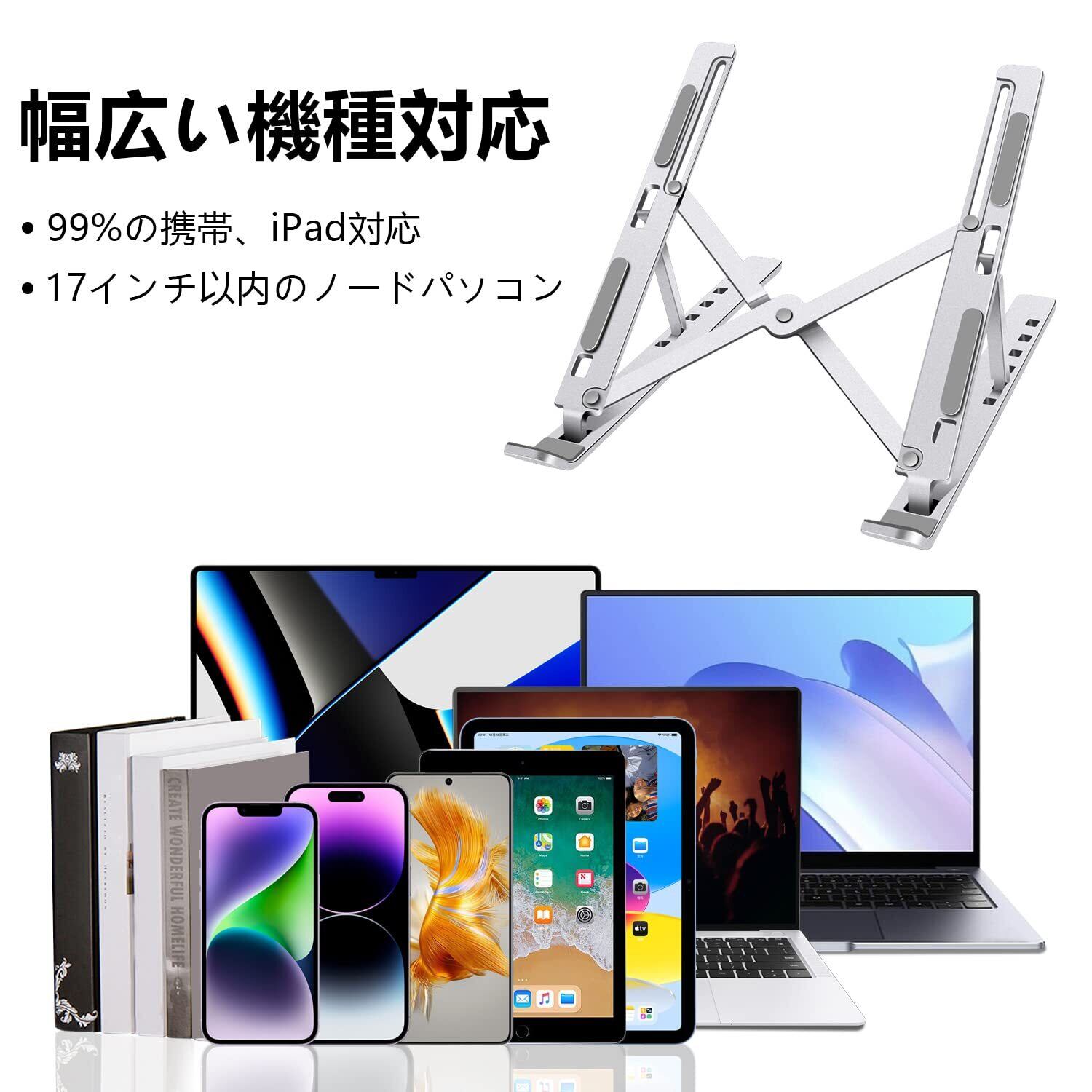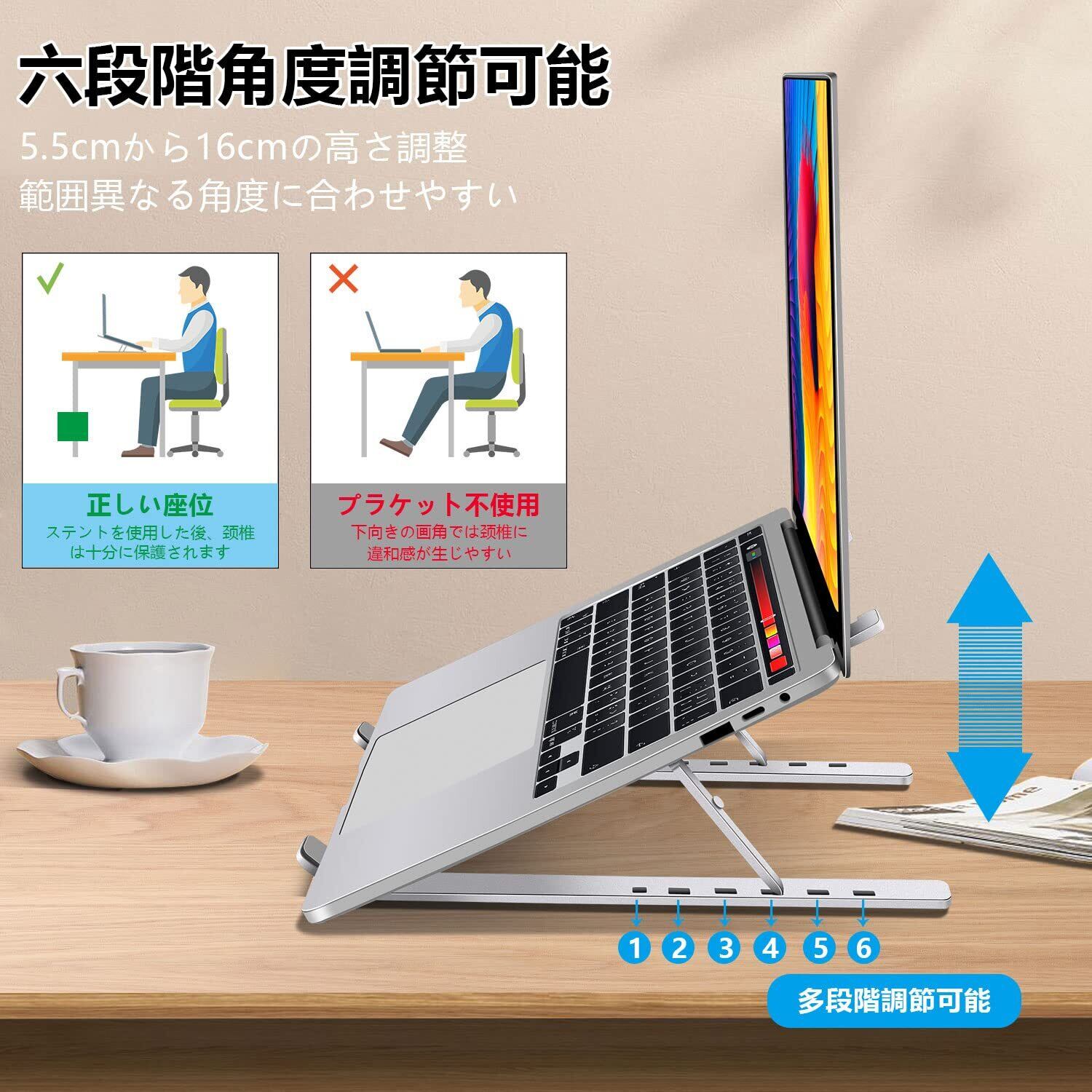 ノートパソコンスタンド PCスタンド タブレットスタンド パソコンスタンド iPadスタンド アルミ合金製 折りたたみ式 滑り止め 軽量 人間工学 高さ 角度6段階調整 収納可能 持ち運びに便利 シルバー