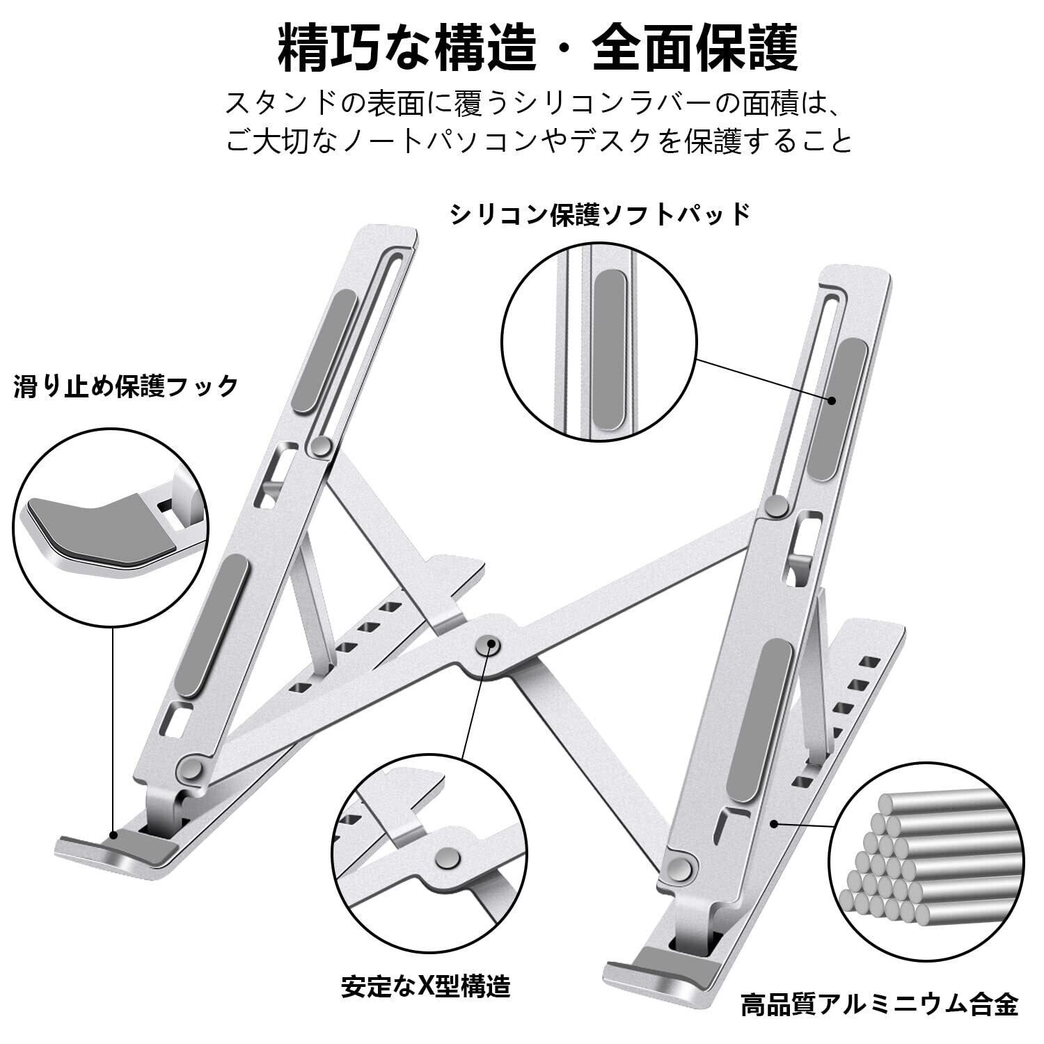 【滑り止め&安定性抜群】ノートパソコン スタンドアルミ合金製,滑り止めシリコンパットはpcスタンドの上と下に付いているので、PCを全面的な保護できるではなく、デスクなどの接触する面も保護できます。高品質連結金具スムーズに引っ張れる、安定性が高い。様々なパソコンの重量を耐えられます。