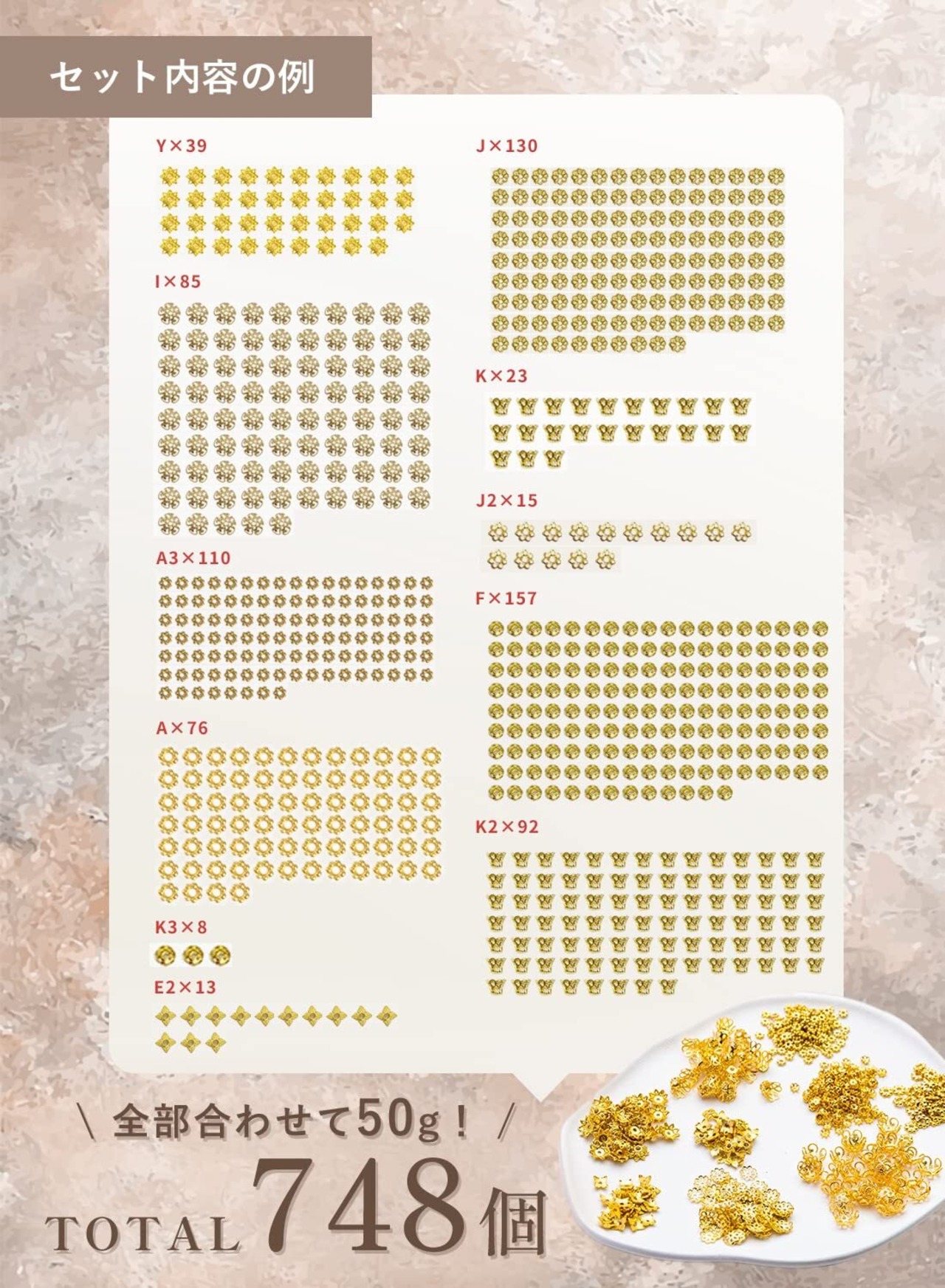 【京珠堂】座金 ビーズ アクセサリーパーツ 50g 金古美 アソートセット ゴールド シルバー (ゴールド)