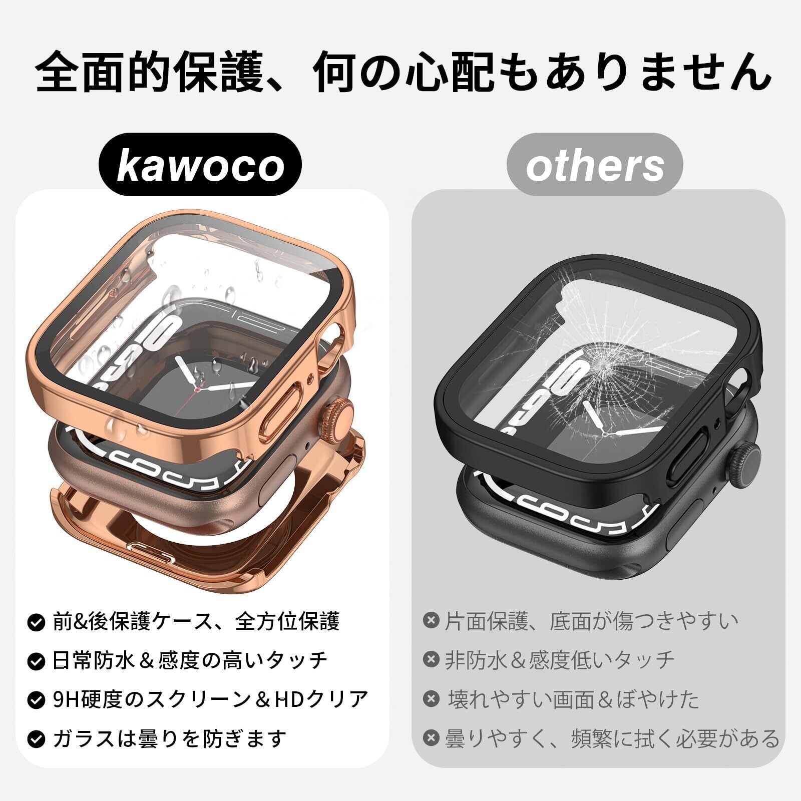 【2 in 1 全面保護】Kawocoアップルウォッチ二重保護ケースは、全方位的な保護に重点を置いています。一体型保護構造全体で、全面カバー型保護ケース、頑丈な背面カバー、9H強化ガラスフィルムから構成されています。全面カバー型保護ケースと背面カバーは、高硬度で耐久性のあるPC素材を採用し、優れた耐衝撃性と耐擦り傷性を実現し、あなたの貴重なApple Watchがさまざまな角度からのダメージを防ぎます。表面保護スクリーンは、超薄型の9H強化ガラスフィルムを採用し、高透過性、高感度の3Dタッチ操作が可能で、画面操作に影響を与えません、裸で使用しているのと、たいして変わらないタッチの反応の良さ。