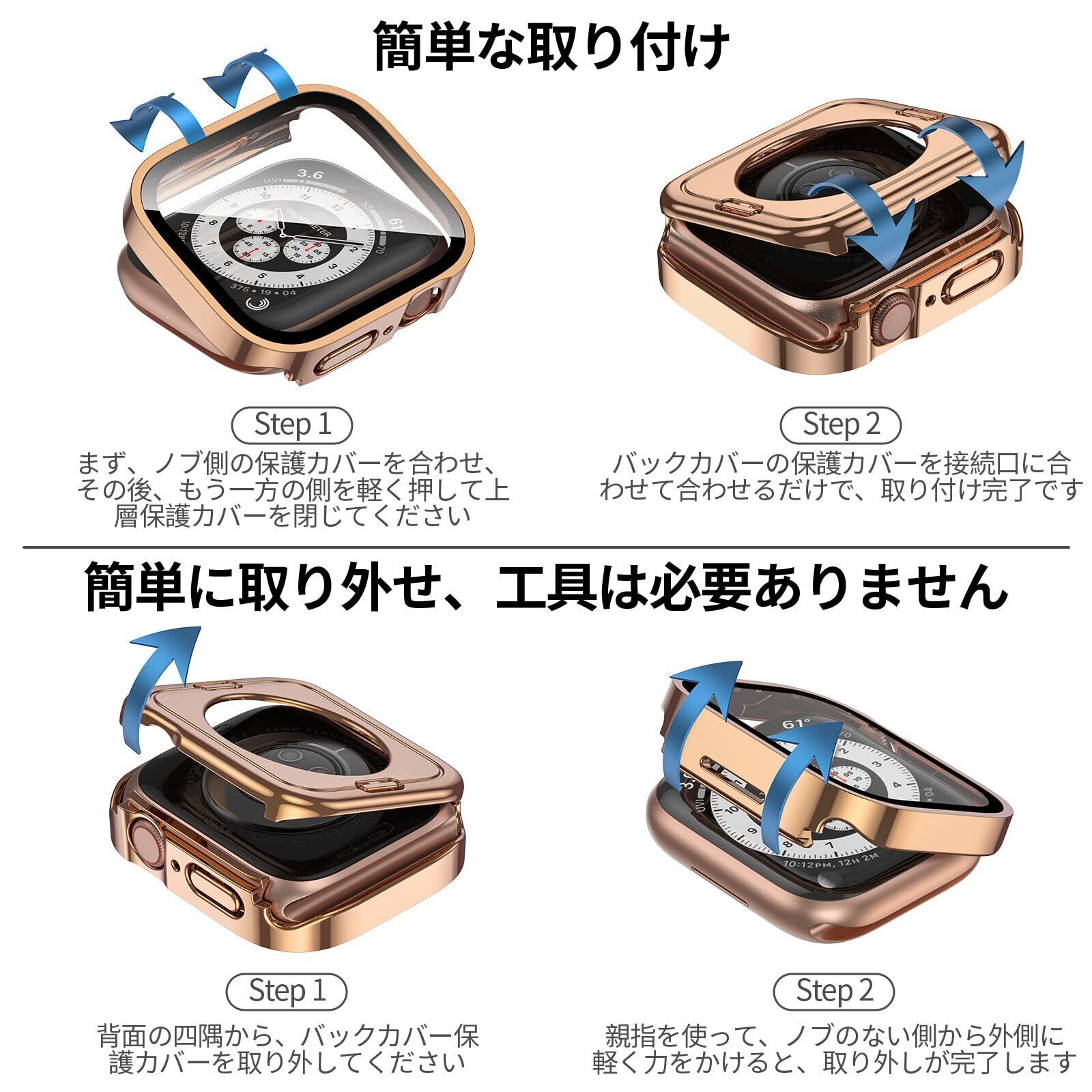 【防水】Apple Watchケースの防水機能は全面的にアップグレードされました。新型保護ケースでは、スクリーンの強化ガラスフィルムの下部に防水ソフトラバーシーリングリングが内蔵されており、水がガラスフィルムと本体の間に入るのを効果的に防ぎ、日常使用中に水に触れることで生じる画面タップ問題を回避し、日常のスポーツや水上活動に最適です。注意水中での活動を行う際には、Apple Watchの指示に従って、高水圧や規定の深さ制限を超えたダイビング活動(例スキューバダイビングやウェイクボード)を行わないでください。