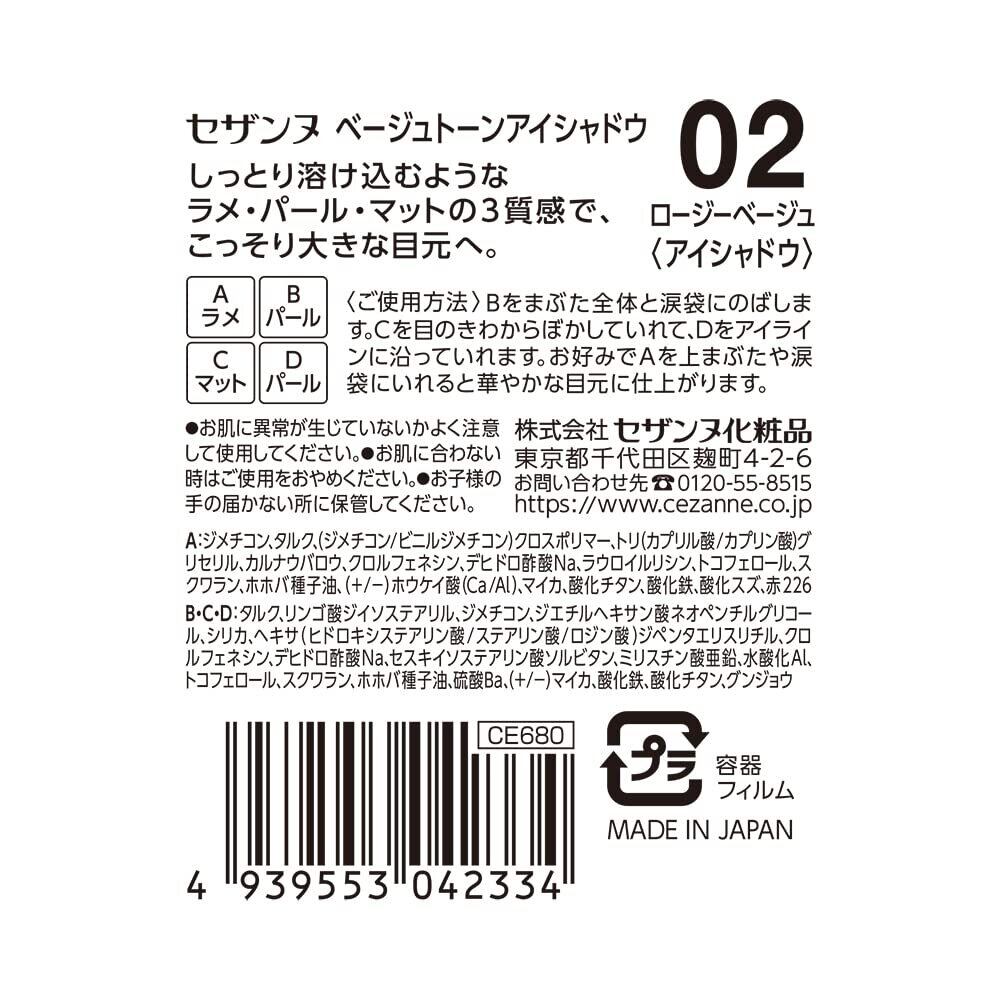 セザンヌ ベージュトーンアイシャドウ 02 ロージーベージュ 4.3g ラメ パール マット 4色アイシャドウ