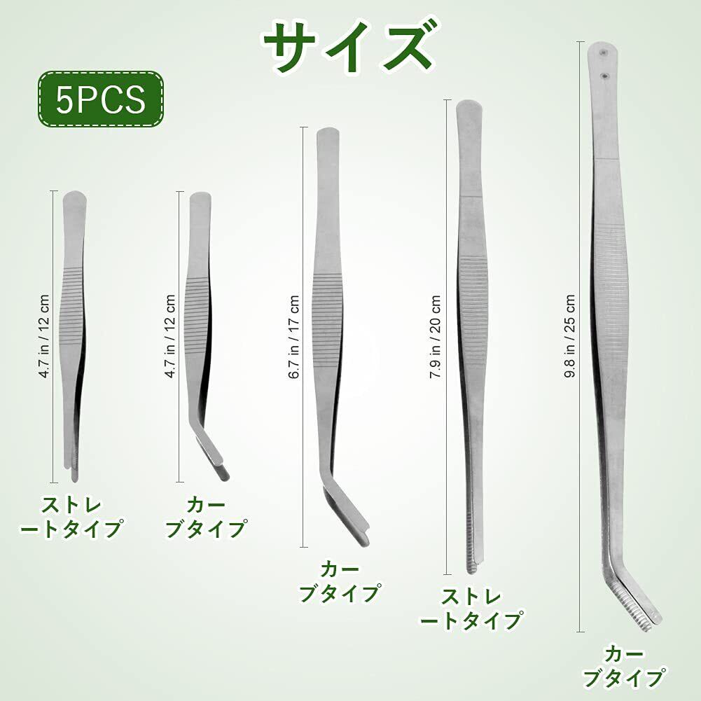 パッケージ内容:12cmストレートピンセット+20cmストレートピンセット+12cmカーブピンセット+17cmカーブピンセット+25cmカーブピンセット。