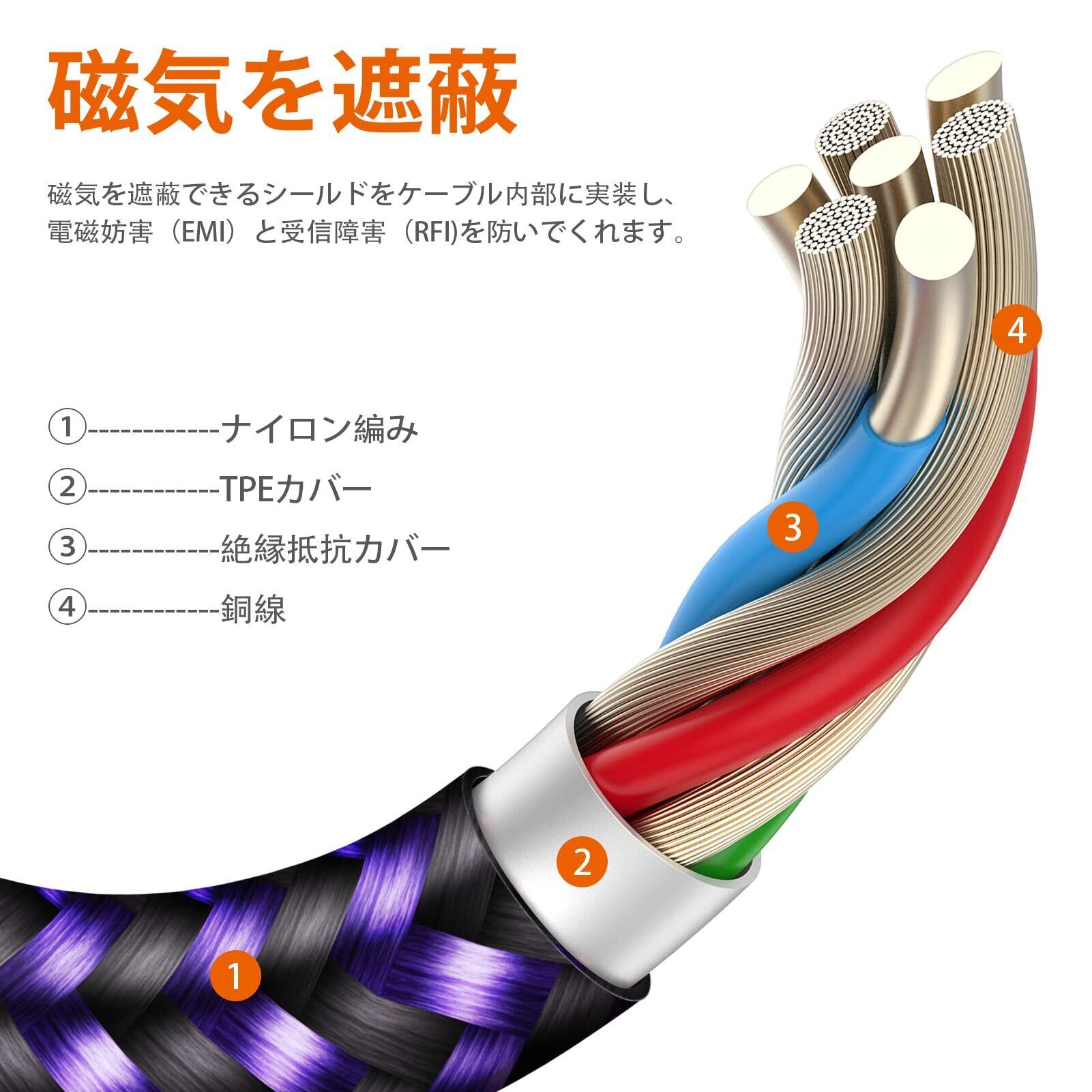 【3重編込のナイロン素材】3重に編み込まれた高耐久ナイロンを採用、ケーブルの強さと柔らかさを両立し、コード部分はねじれや折れに強く、断線しにくい。内部も高品質な素材で仕上げており、充電を繰り返しても劣化しにくく、長期間お使いいただけます。