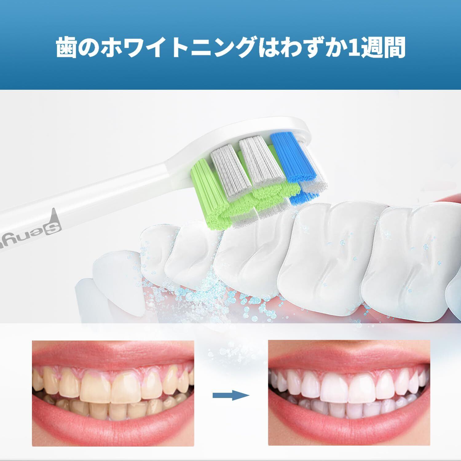 白い歯が輝く魅力的な笑顔:Senyum電動歯ブラシ 替えブラシヘッドの毛は、密集をしていて、ブラッシング接触面積を最大化にして、手動歯ブラシより7倍以上のクレンジング効果を提供できます。僅かな1週間で効果的なホワイトニングを実現します!