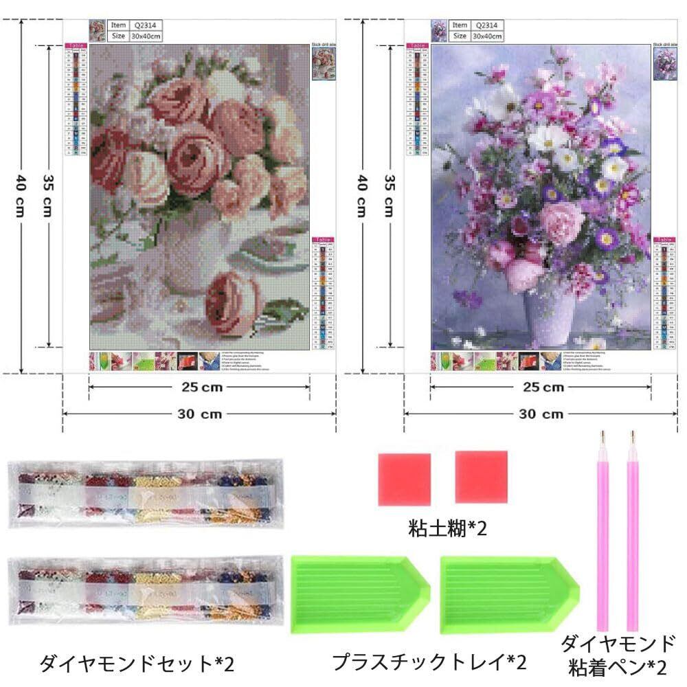 セット内容:ダイヤモンド絵画セット2セット(フレームを含まない)、ダイヤモンドセット+ダイヤモンド粘筆+プラスチックトレイ+油絵布+粘土糊各2点を含む。油絵布サイズ:約30×40 cm、操作サイズ:約25 cm*35 cm。