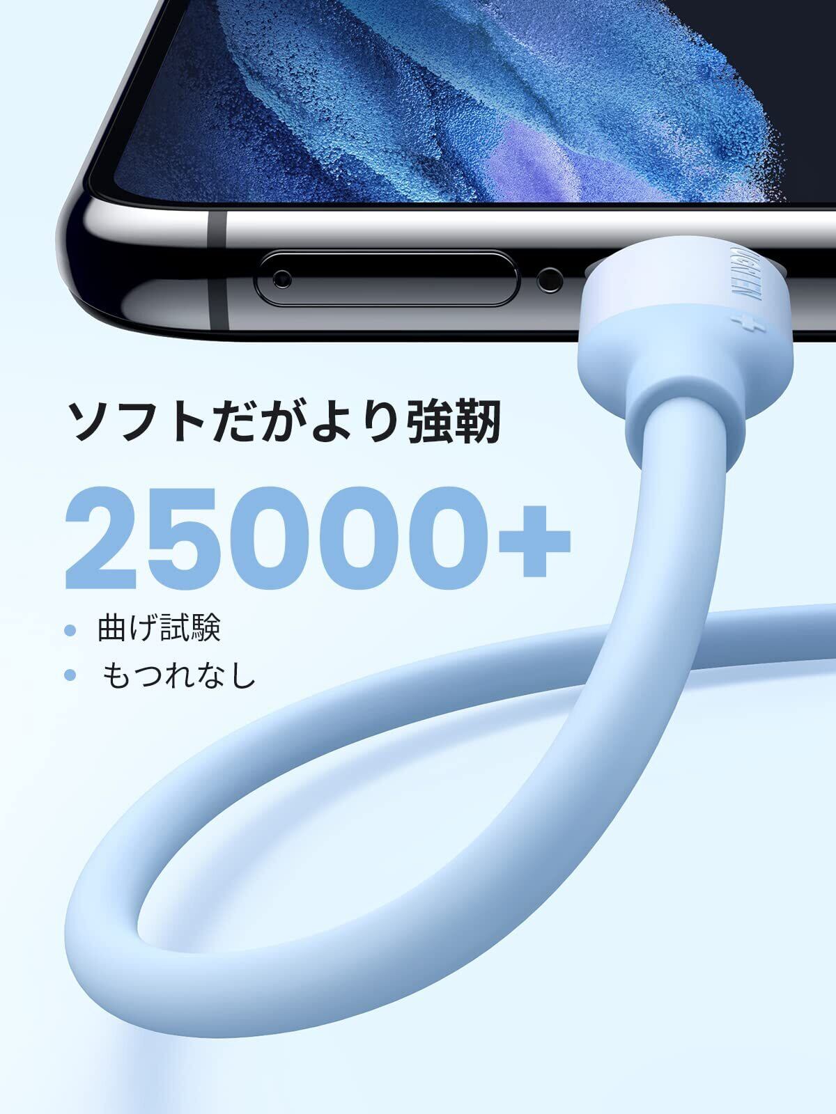 【柔らかくシリコン素材】従来のケーブルにはない肌に優しいシリコン素材を使用した、ケーブル内部の銅線をグラフェンで覆い、カバンやポケットに入れても絡みにくいです。2,5000回の折り曲げテストを実施し、断線しにくく、高い耐久性高いusb-c ケーブルです。