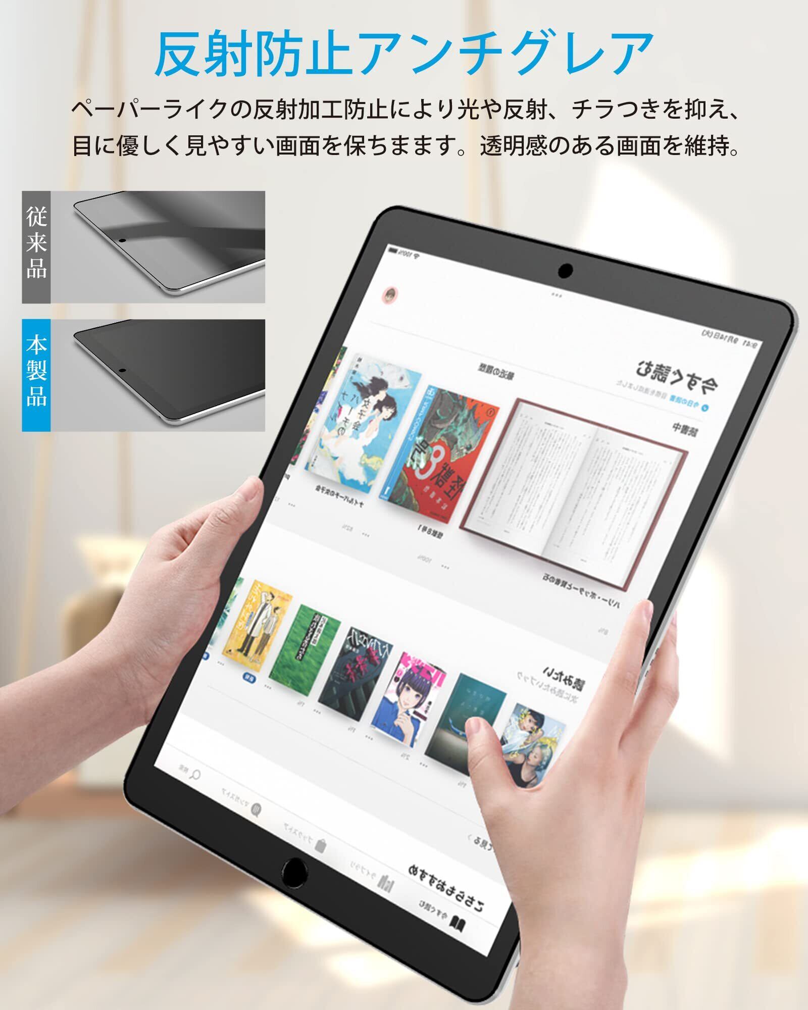 【反射防止・指紋防止】ペーパーライクのアンチグレア加工防止、太陽や照明の反射を抑え、光の映り込みを防ぎため、アウトドアで端末の使用に影響が有りません、目に優しく見やすい画面を保ちます。撥油加工をしており、指紋や汚れが付きにくくになり、付着しても簡単に拭き取れます。常に美しい画面と滑らかでよい操作が得られます。