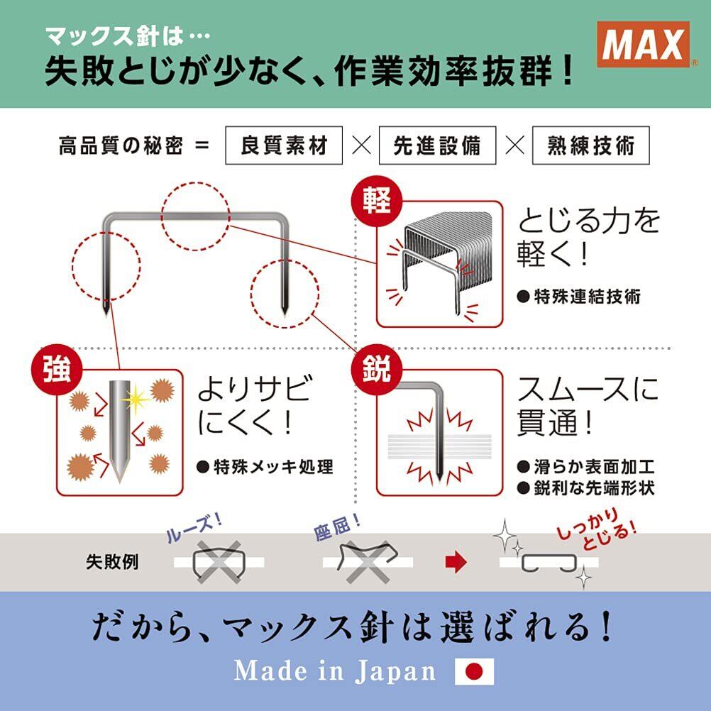 マックスでは、紙を綴じるのに最適な先端形状を維持するため、マックス独自の設備で万全の品質管理のもとに針を製造しているから安心! 1箱に1000本入。 適合機種:HD-10FL2・10FS・10DFL・10/B・10D・10NX・10DB・10NL・10NLCK・10V・HP-10