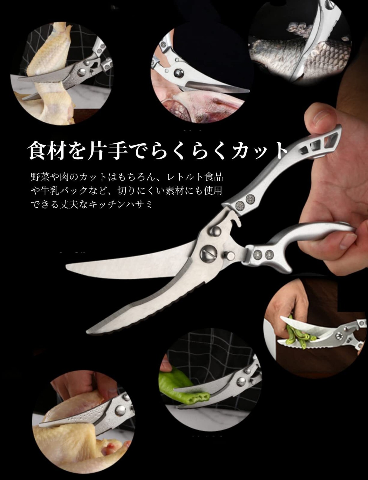 【ステンレス製キッチンはさみ】環境にやさしいハサミ!高品質でサビに強い特殊ステンレス鋼を使用。刃にはマイクロエッジング加工を施され、持ち手はアルミ合金製で、握りやすくて、抗菌加工で衛生的。