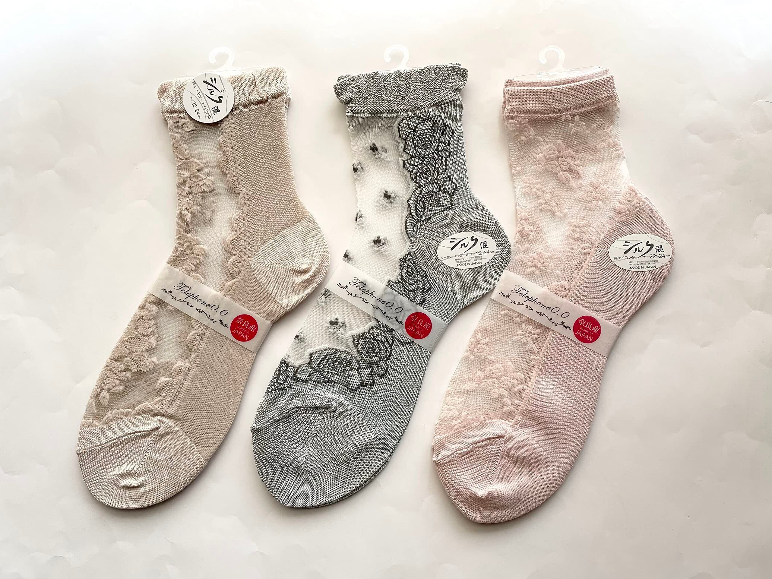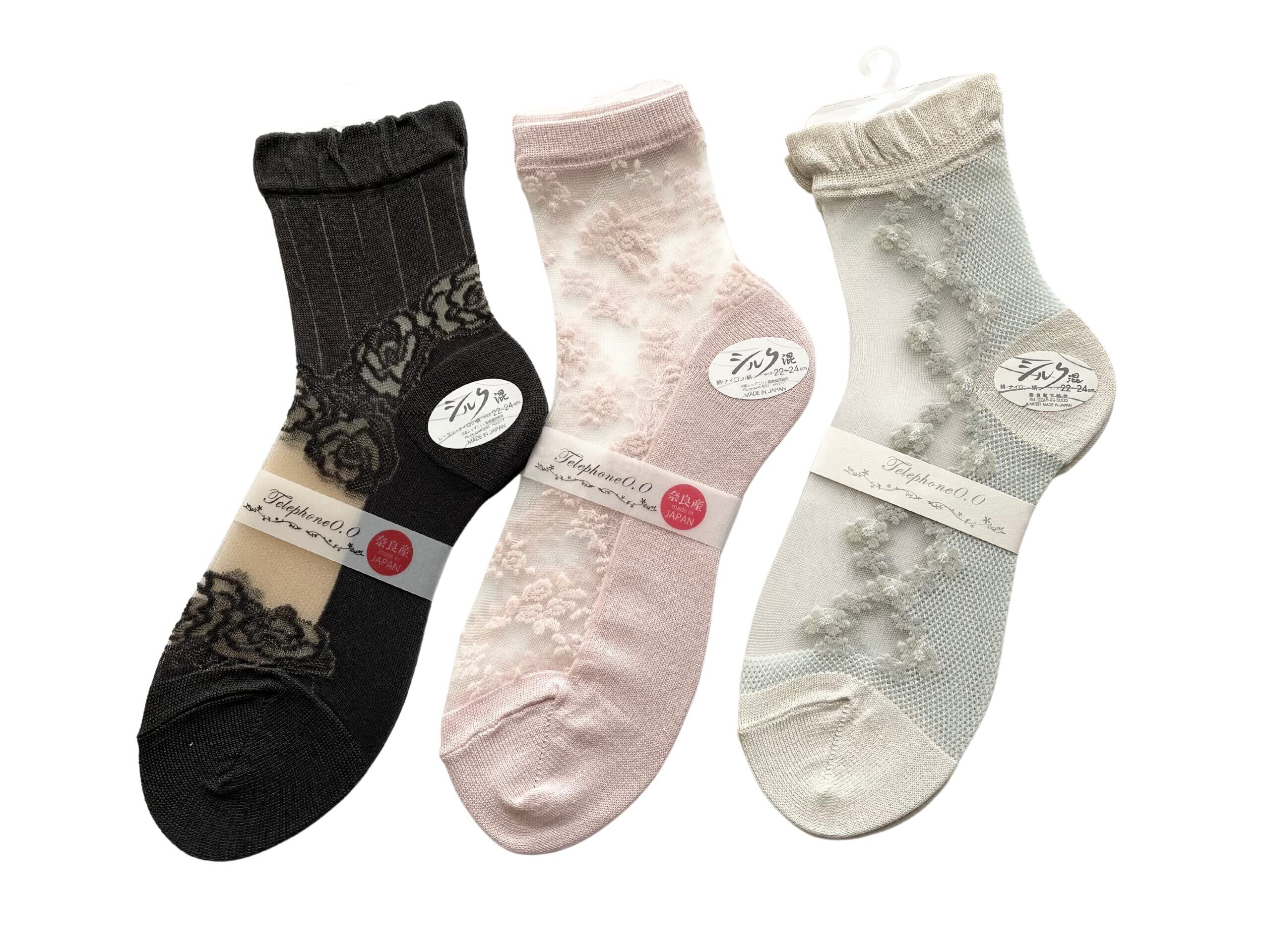 日本製 靴下 レディース 夏用 かわいい シースルー ソックス 絹 シルク混 ソックス 薄手 おしゃれ 22-24cm 3足セット(柄はお任せ)