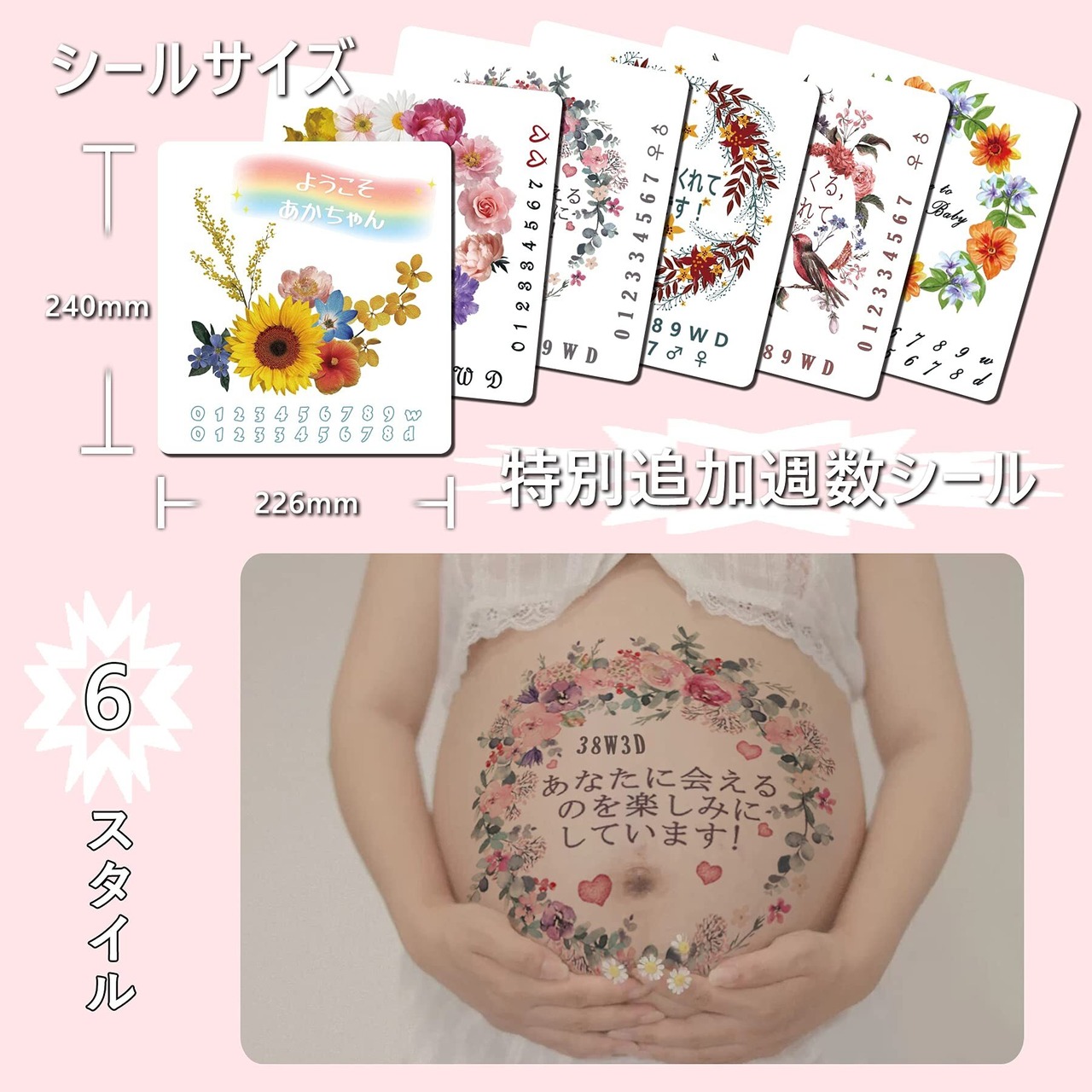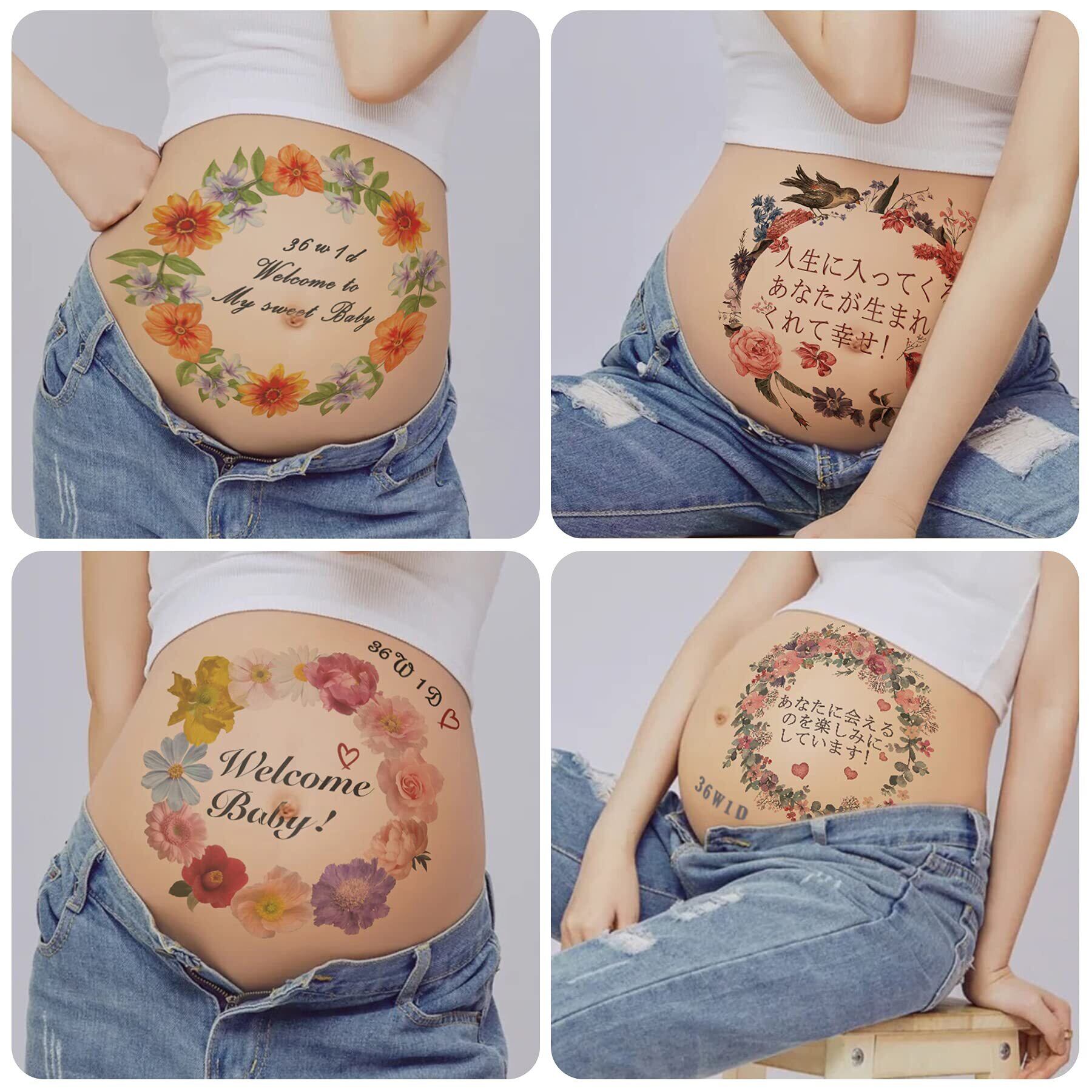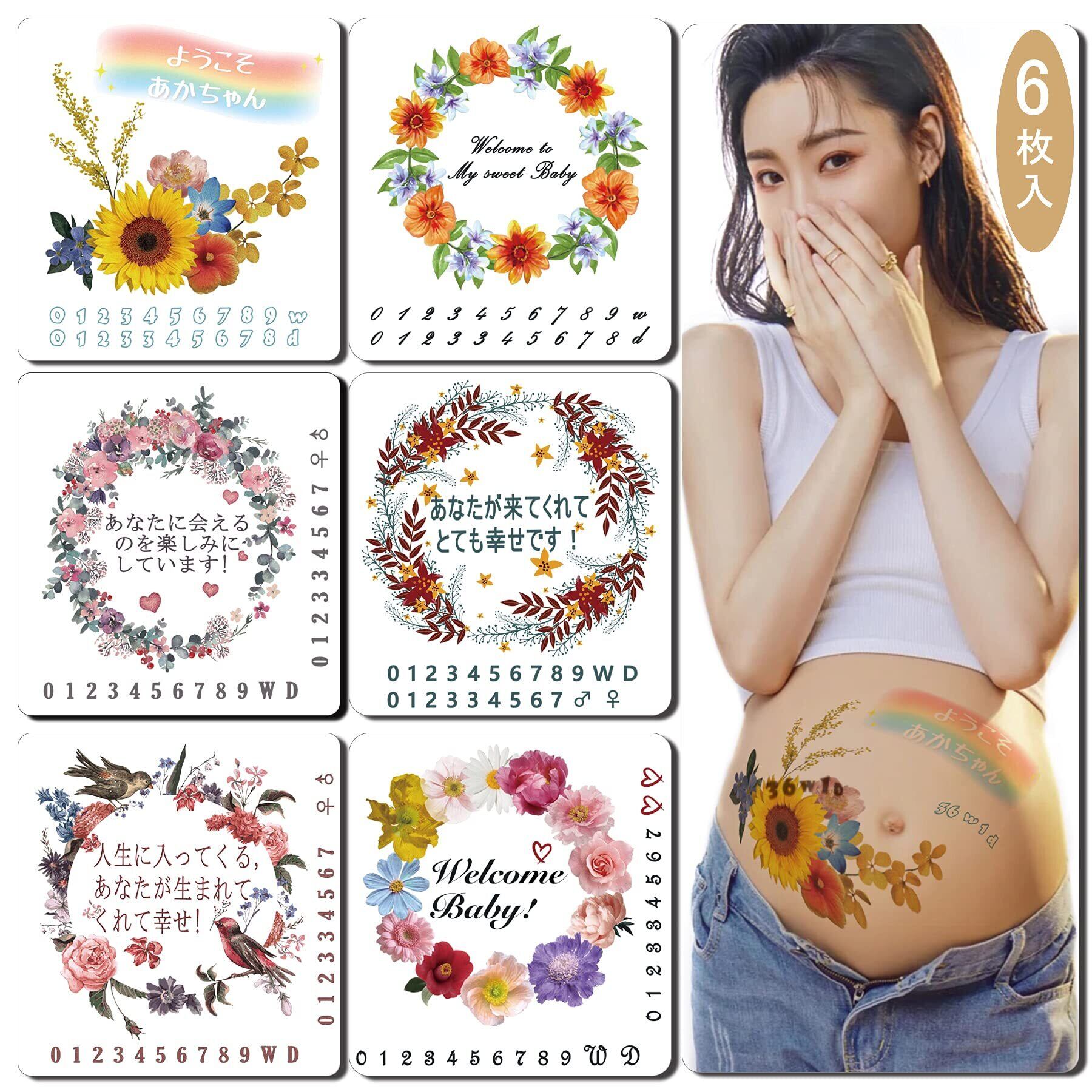 一時的なタトゥー,6枚妊婦のためのかわいい3D防水リアルタトゥーステッカー、花、テキスト、女性のための動物のタトゥーステッカー、ベリーペイント ボディ シール 赤ちゃん 大判 ペイントシール マタニティ 虹とBABYイラスト 天使 手書き風 メッセージ 特别追加週数