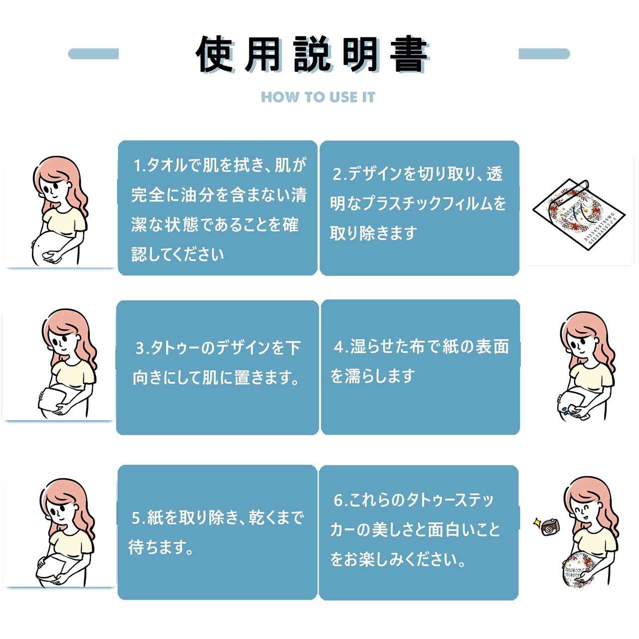 【ホールド時間】この特別なかわいい妊婦のタトゥーステッカーは防水性があるので、異物との強い摩擦なしに一般的に約4〜6日続くことができます。タトゥーステッカーの使用方法については、説明を参照してください。