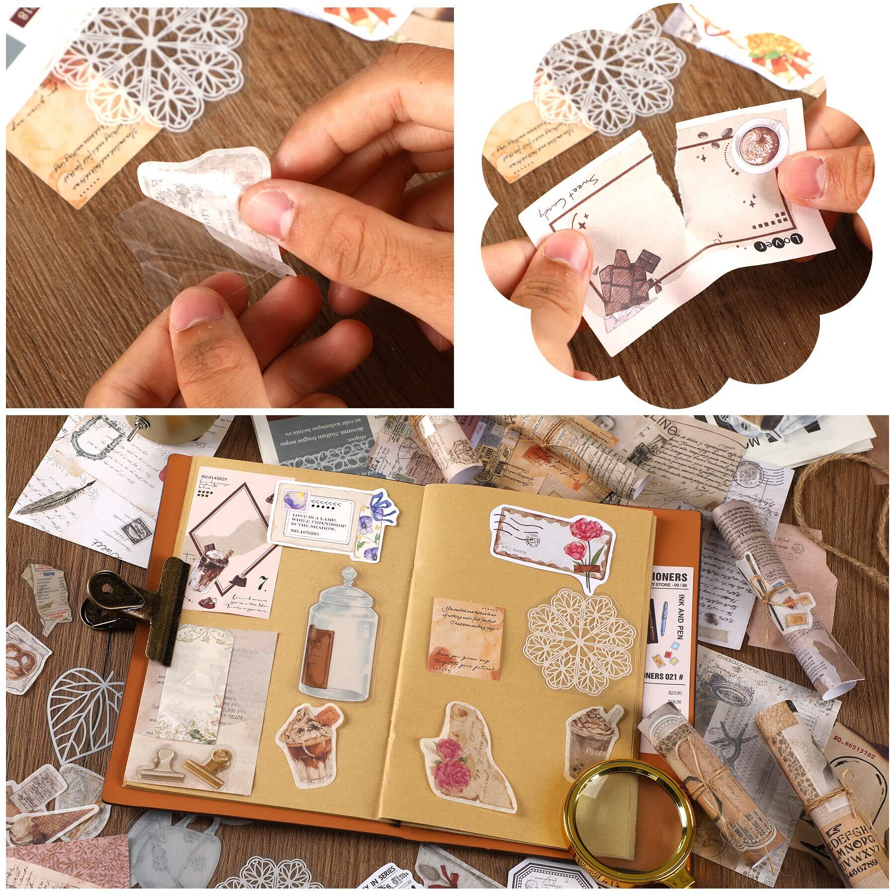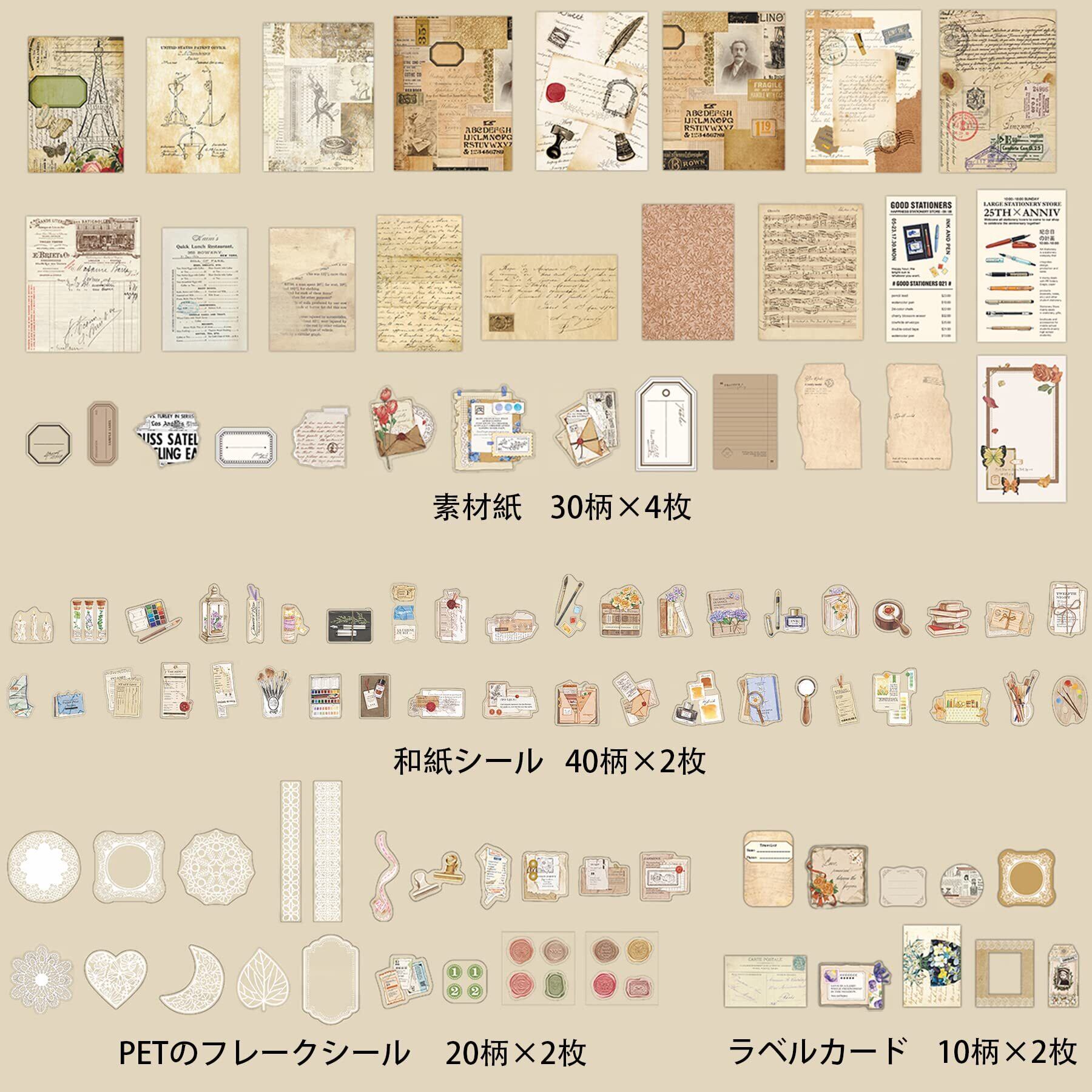 【大量なセット】パッケージには2パックのコラージュ 素材が入っており、各パックに80枚の和紙シール、120枚のデザインペーパー、20枚のクラフトタグ、40枚のPET製のフレークシールがあります。