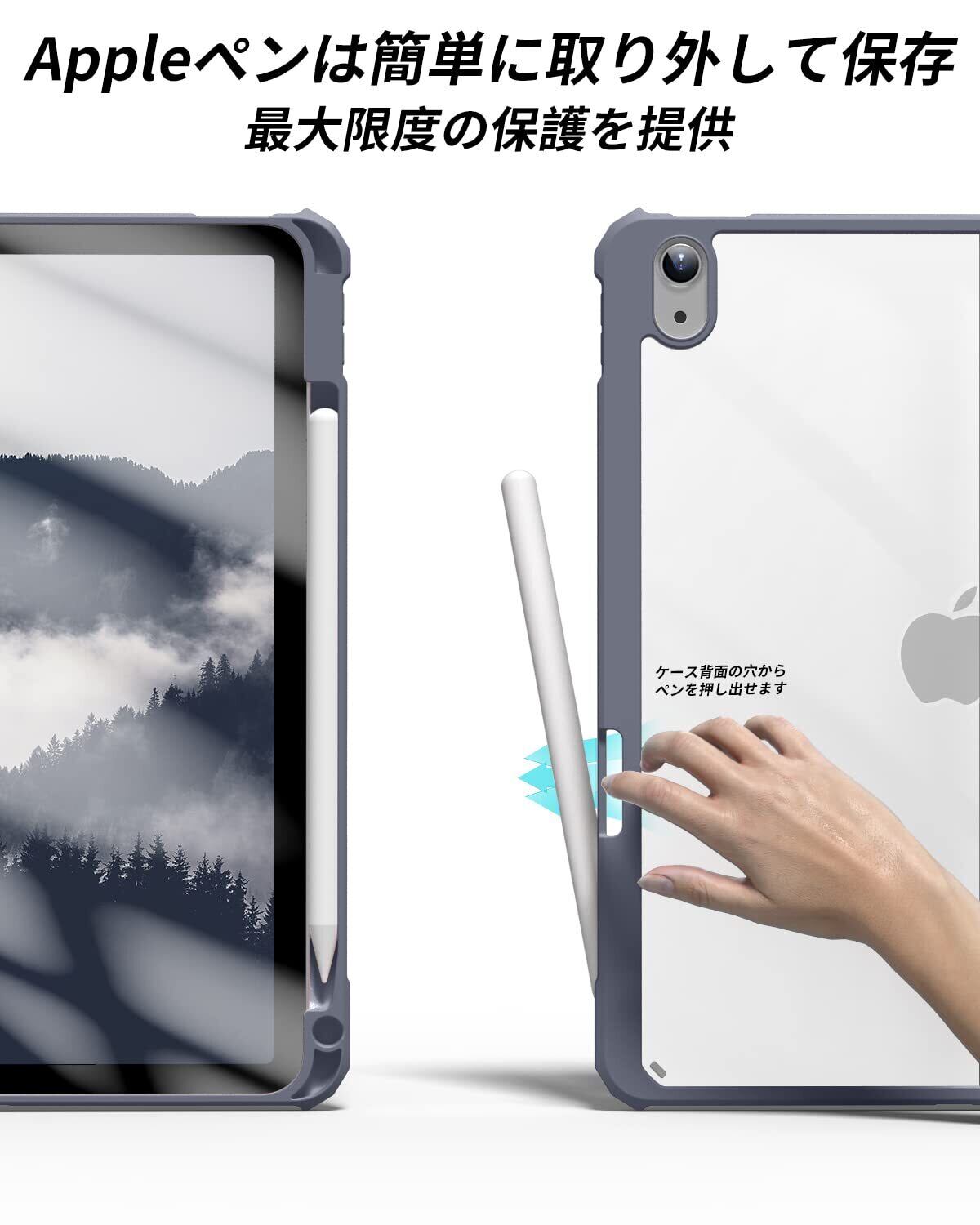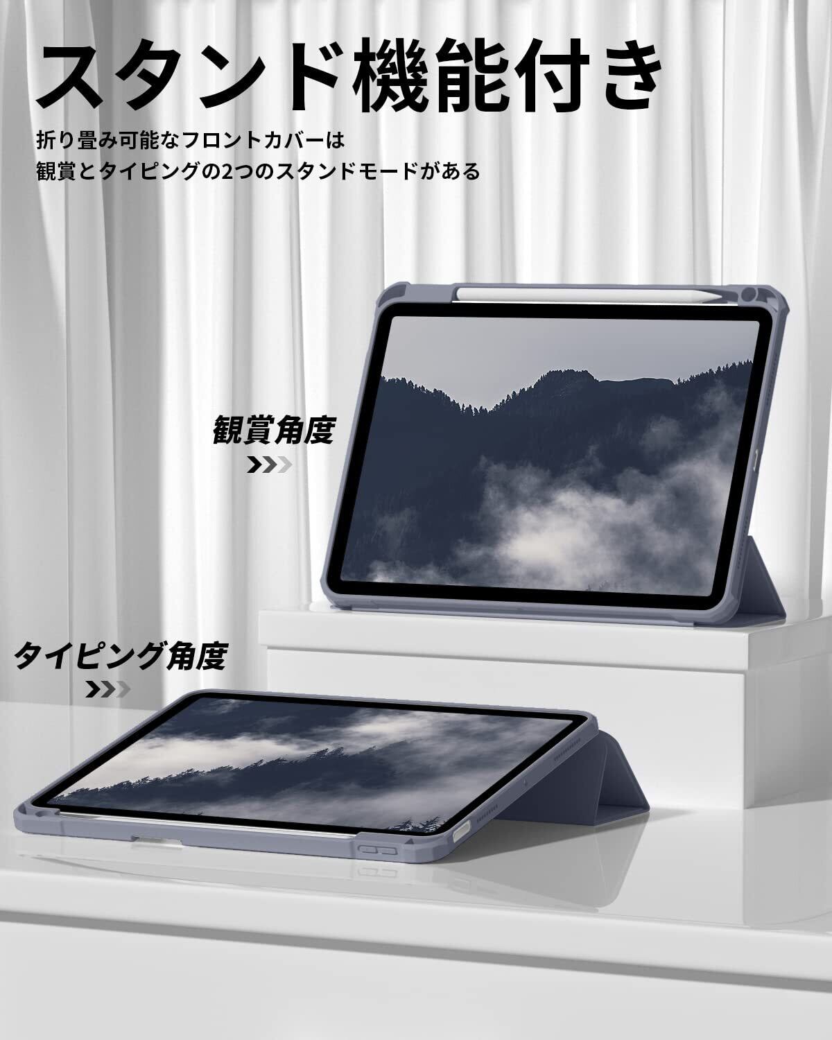 【材料・透明バックカバー】 ケースの表面はPUレザー素材を利用して、軽量、超薄を備えます。ポリカーボネート素材を採用している透明バックカバーは汚れや傷つけなどを防止するだけでなく、iPad本体の色と美しさも活かせます。透明バックカバーの枠は柔軟な TPUを採用して、取り付けも簡単にできます。フロントカバー内部材質はマイクロファイバーで、摩擦によって発生する傷を抑え、液晶画面を保護しきれいに保ちます。