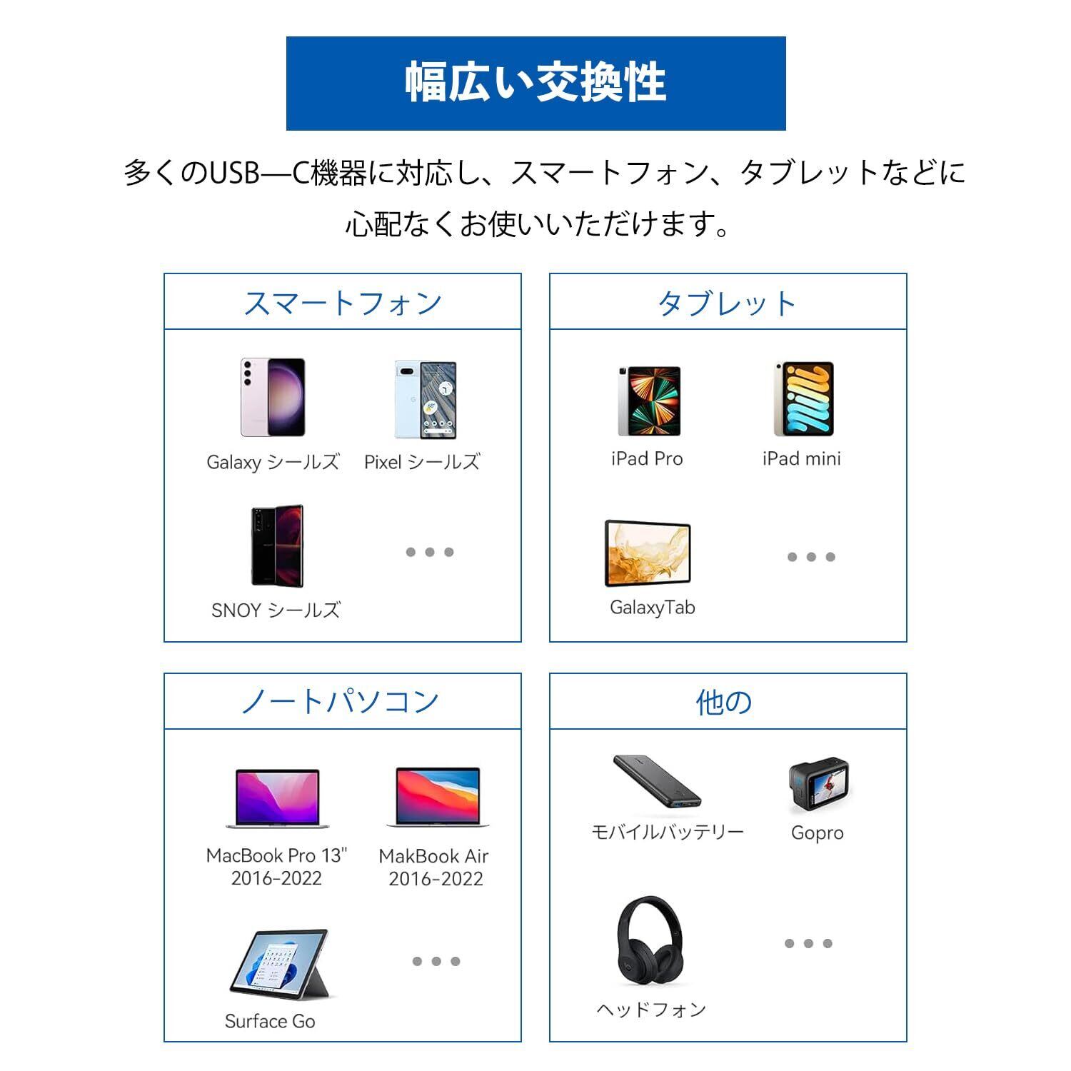【幅広い対応性】USB-Cに対応したスマートホン、ゲーム機、パソコン及びその他のデジタル端末に対応します。MacBook Pro 14" 2021、MacBook Pro 16"、MacBook Pro 15.4"、MacBook Pro 13.3"、MacBook Air 2018-2020、MacBook 2015-2017、iPad Pro 2018-2020、iMac(2020)/iMac Pro/Mac mini(2018)、Surface、Switch、Xperia、Galaxy、Pixel等Type C機種対応。