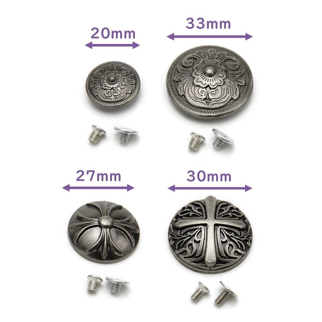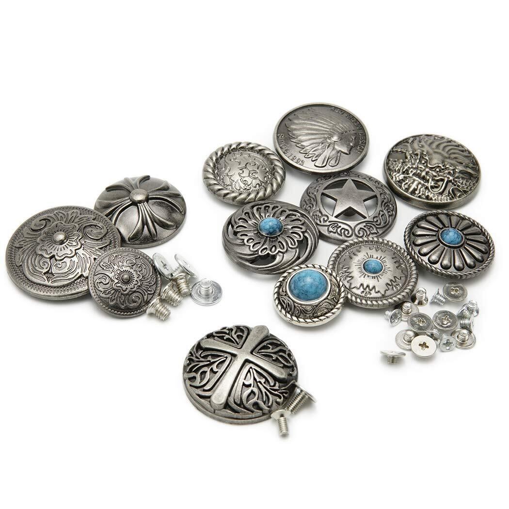コンチョ ボタン 12個セット ねじ式 アンティーク シルバー 20mm~33mm ターコイズ 唐草 インディアン 龍 五芒星 さくら レザークラフト 財布 手芸