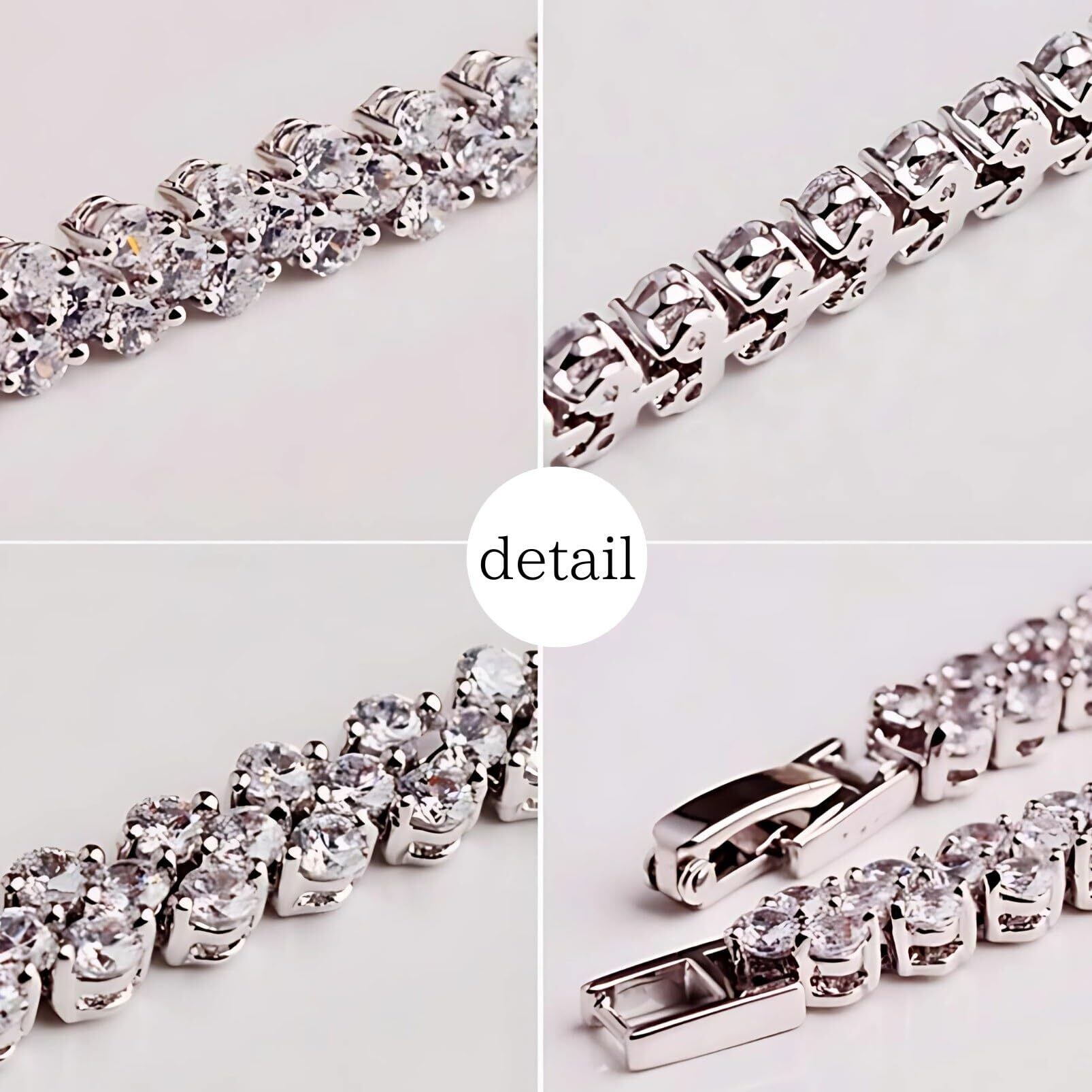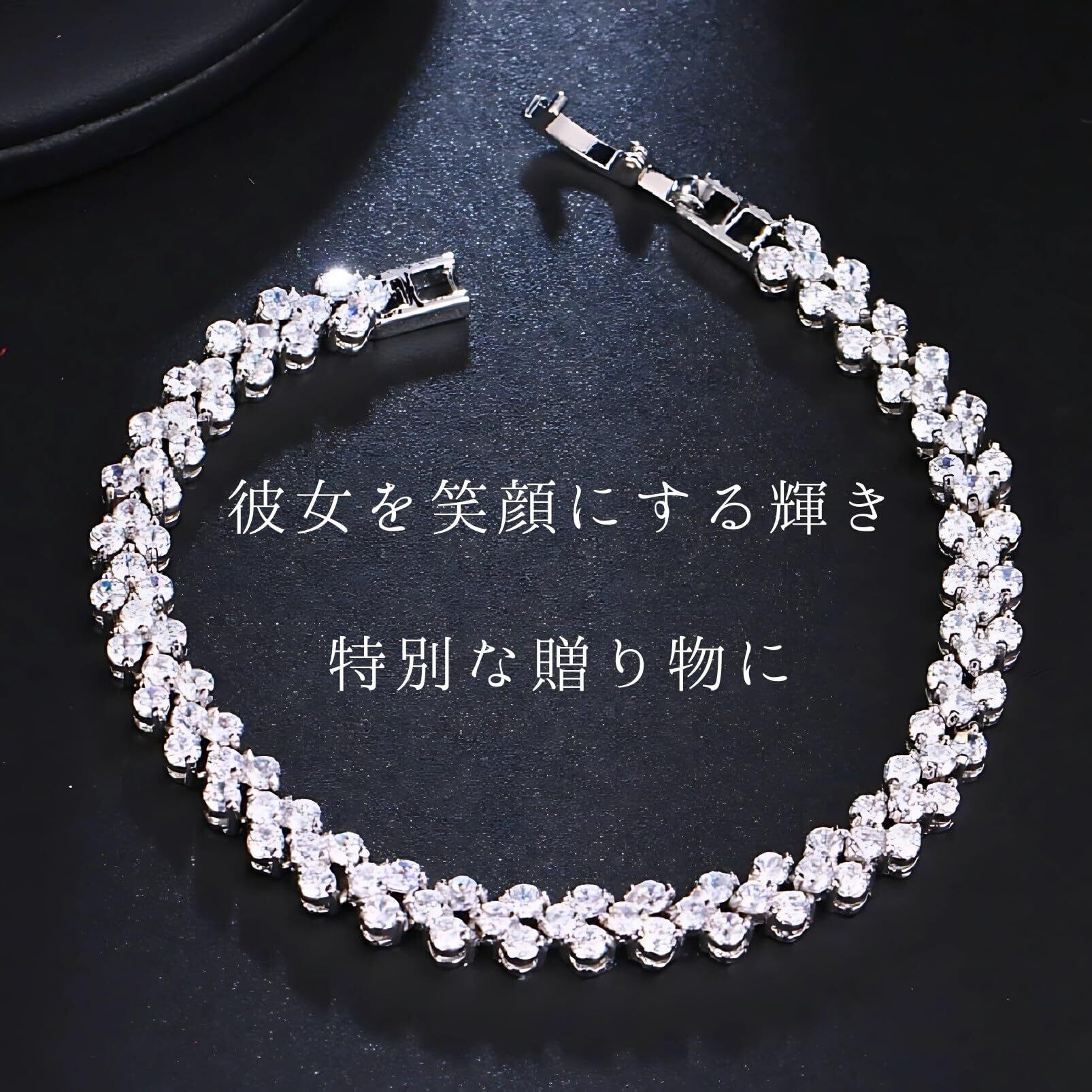 【可憐なシルバーブレスレット】64石のをCubic zirconiaを贅沢に使用した豪華なテニスブレスレット。キュービックジルコニアが放つ繊細な光は、あなたの女性らしい魅力を最大限に引き出します。シルバートーンが肌を明るく見せ、美人度を自然にUP。着けていることを忘れるほどの軽やかさで、毎日のお守りジュエリーとしても最適です。リストに輝きを与える事で、美しく若々しい印象を与えてくれます。ふとした瞬間に視界に入る、キラキラと輝く自分の手元が自身と勇気を与えてくれます