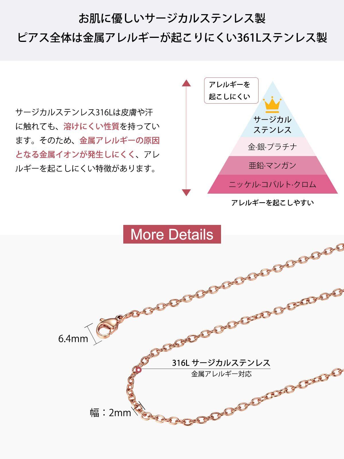 サージカルステンレスチェーン:316Lステンレスは医療現場でも使用されている耐食性と硬度に非常に優れた金属です。汗などで金属イオンが溶け出しにくく、金属アレルギーを起こしにくい特徴があります。傷つきにくく汗・海水や温泉にもサビにくいお手入れいらずな素材ですので、 ストレスなく気軽くにジュエリーをお楽しみいただけます。