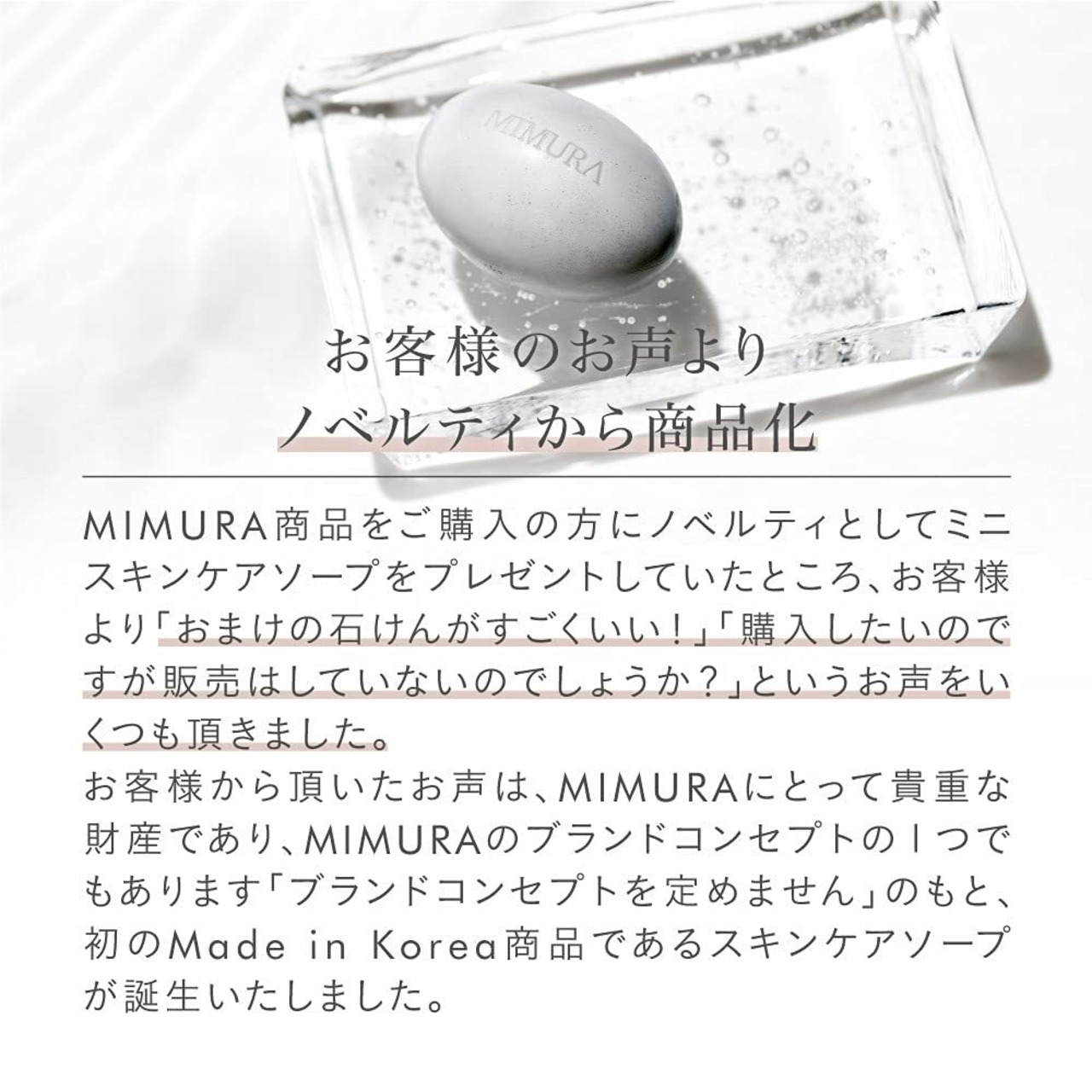 【お客様のお声から商品化】MIMURA商品をご購入の方にノベルティとしてミニスキンケアソープをプレゼントしていたところ、お客様より「おまけの石けんがすごくいい!」「購入したいのですが販売はしていないのでしょうか?」というお声をいくつも頂き、初のmade in Korea商品であるスキンケアソープが誕生いたしました。