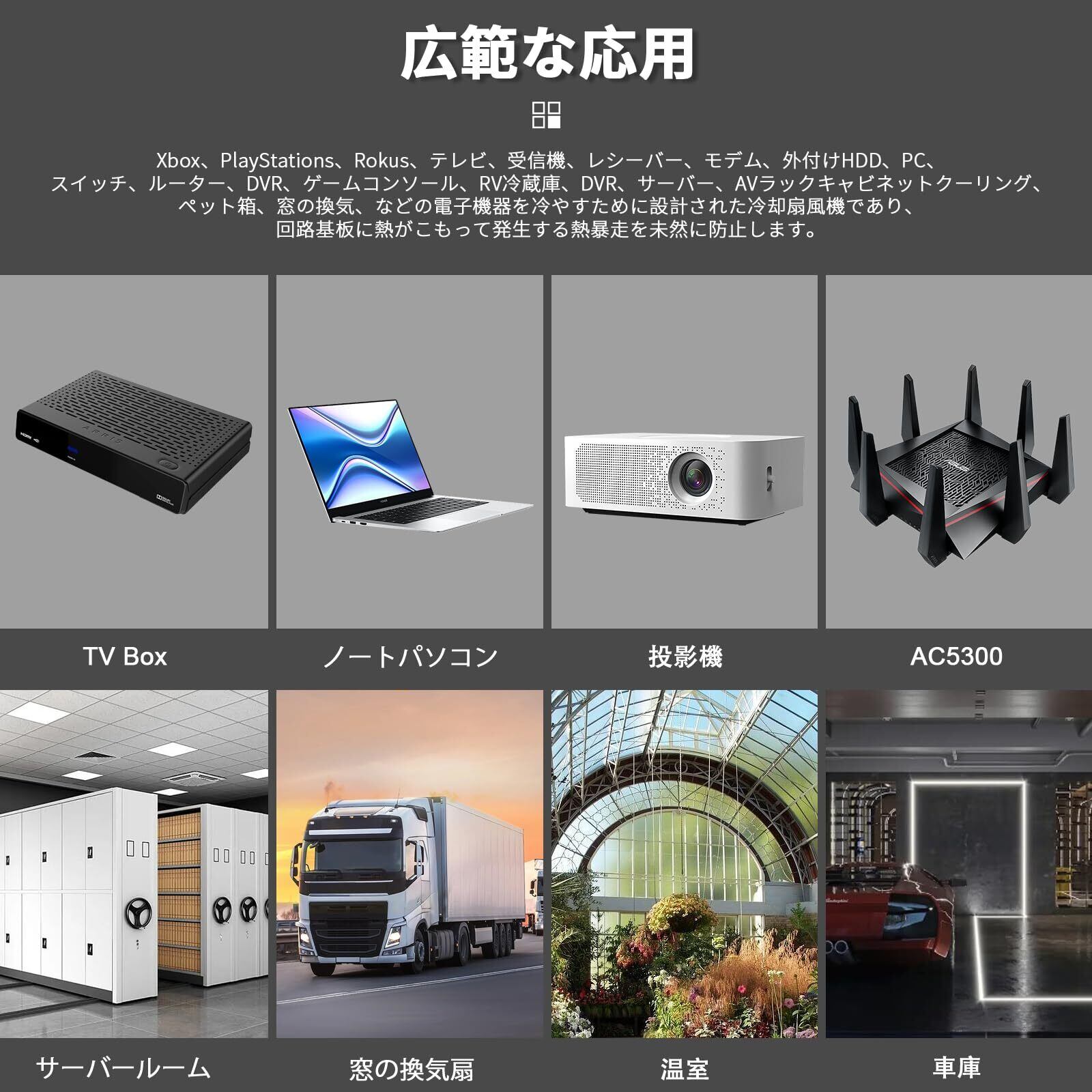 【幅広い実用性】外付けHDD、ルーター、AV機器、スマフォ、PS4ゲーム機、ハードディスク、PC冷却用などの電子機械を冷やすために設計された冷却扇風機であり、熱がこもり、熱暴走などの問題を解決します。卓上扇風機として、車中泊、ハイエース 換気扇、空気の循環などのシーンにもご利用いただけます。浴室、トイレ、育成用テント、塗装ブースなどに設置して換気することができます。