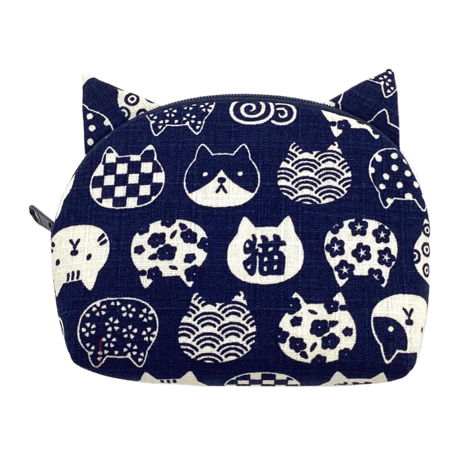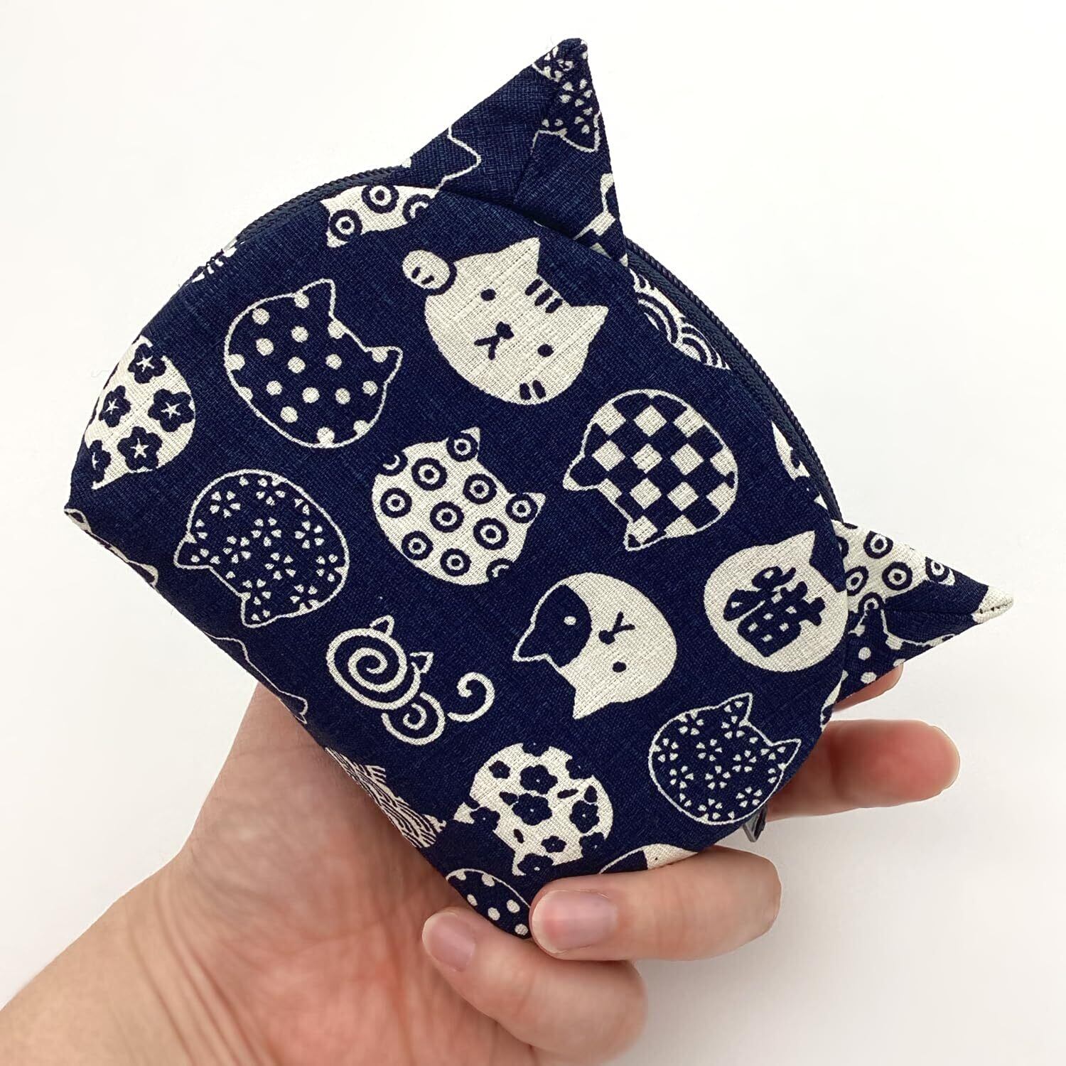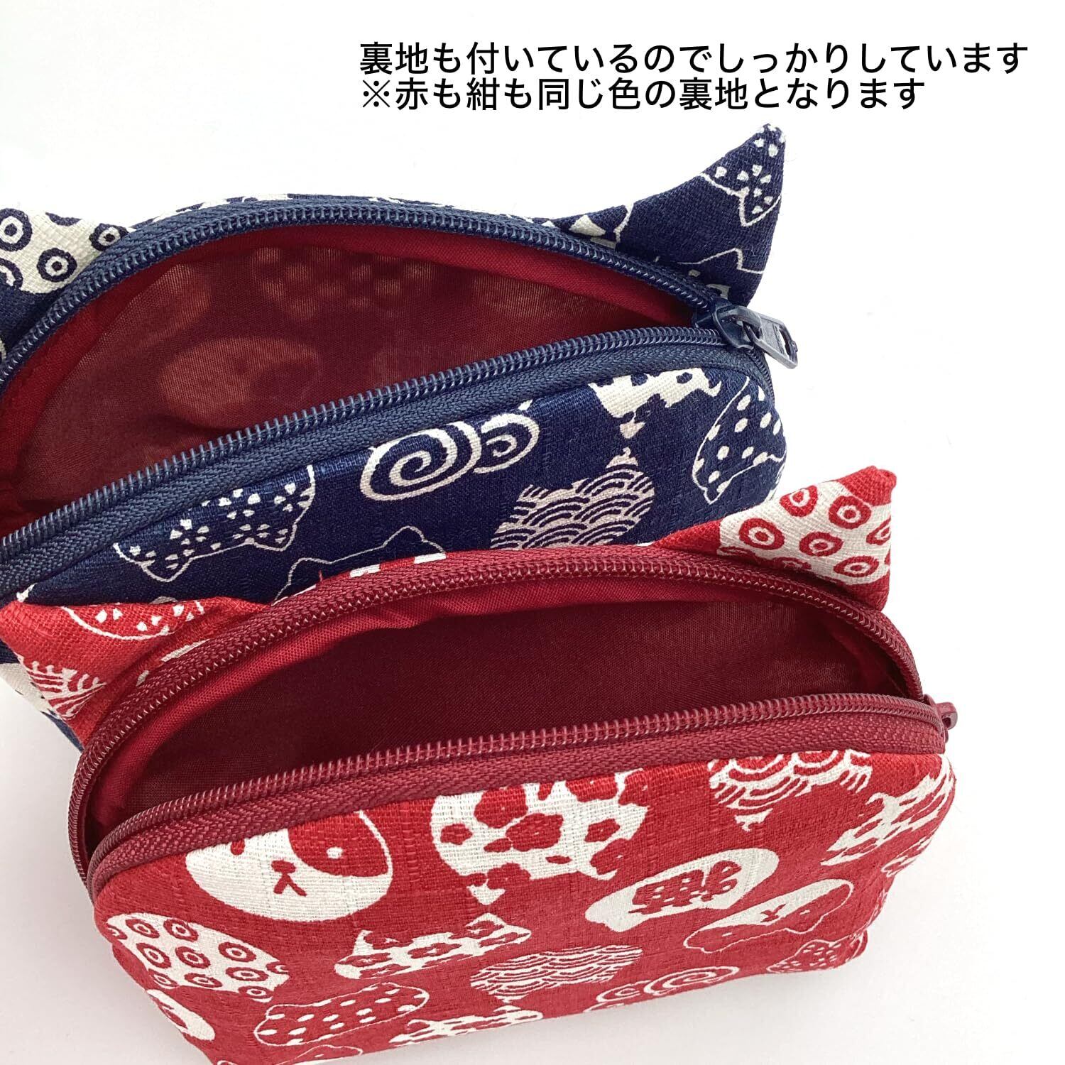 京佑 日本製 京都 耳付き ポーチ 約10×13×4cm ねこ柄 小物入れ 和柄 綿 にゃんこもん 紺