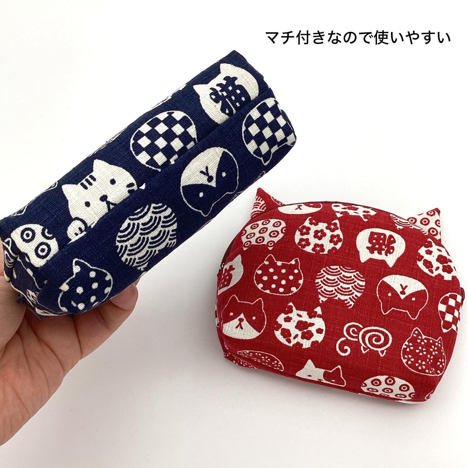 耳が付いたころっと可愛いねこ柄のポーチです。和風レトロな柄が愛らしい、使い勝手の良いファスナータイプのポーチです。軽量なのでバッグの中でもかさばりません。メイク道具や小物、充電器、飴ちゃんやお薬入れなど、使い方はいろいろ。旅行の仕分け用にも活躍します。マチは4cmあります。普段使いに良いサイズ感。プレゼントやギフトとしても渡しやすいです。