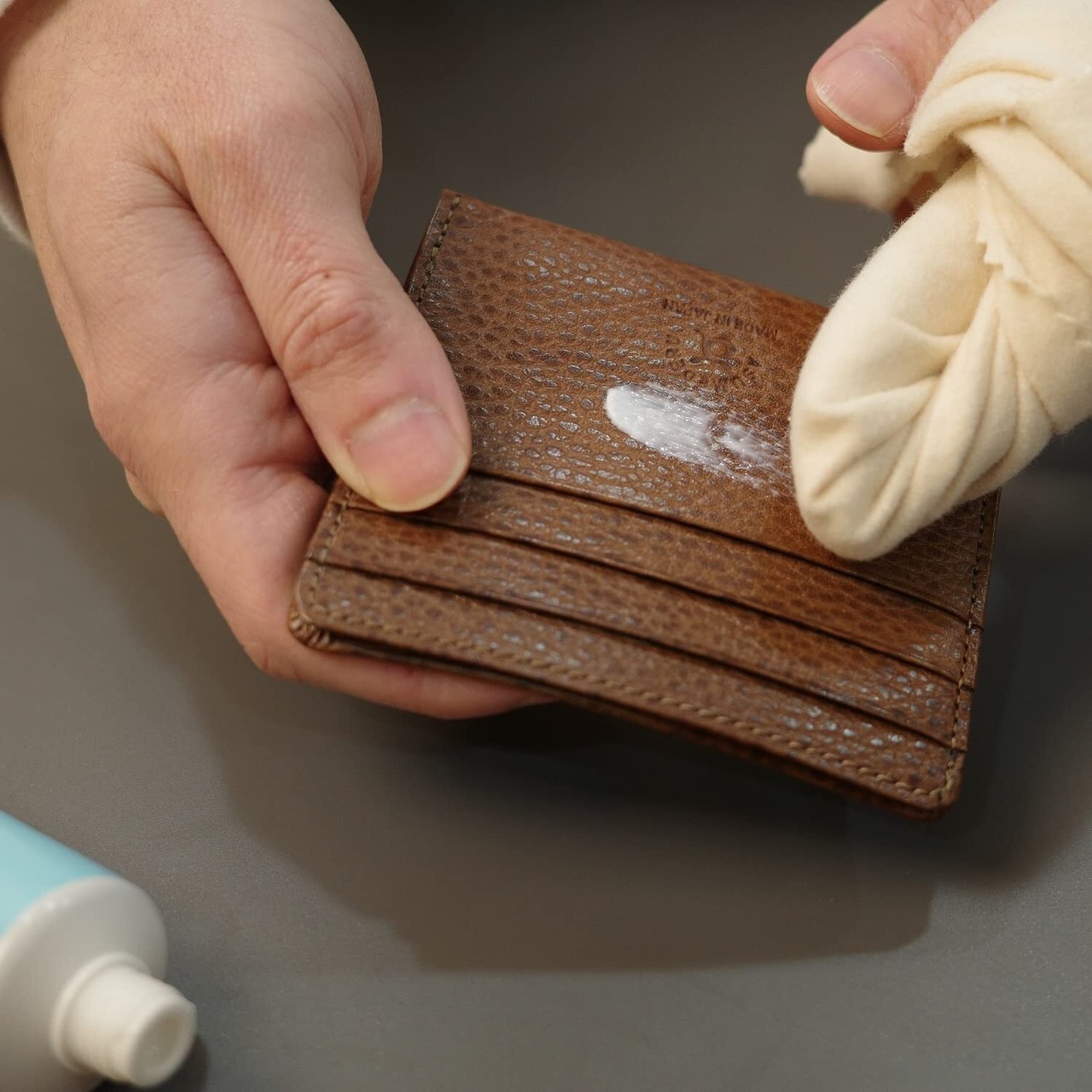 ●クリーナーを柔らかい布に取り、汚れを拭き取ってください。 ※クリーナーは直接革につけず必ず布に取ってご使用ください。