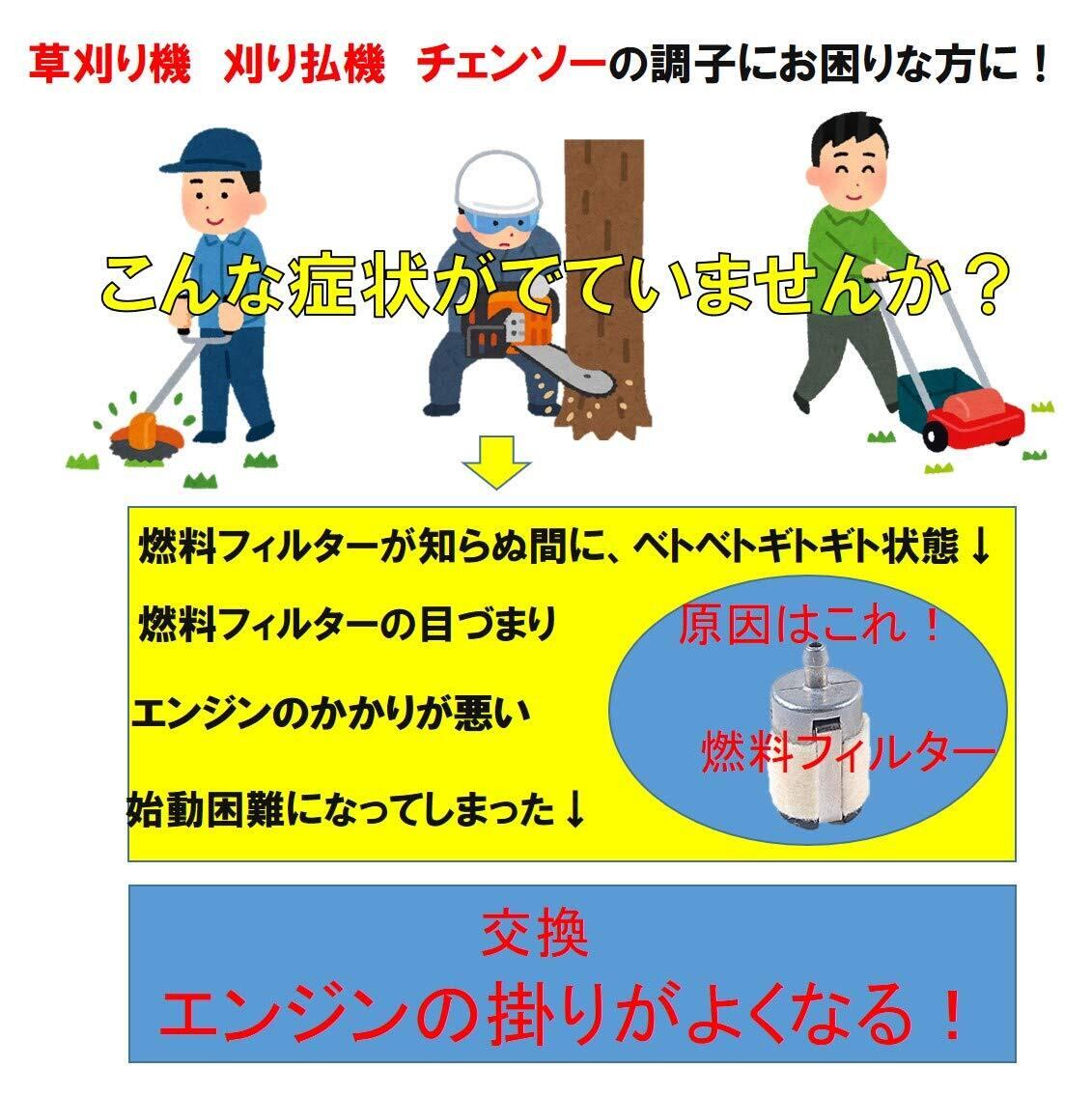 【こんな商品】エンジンの掛りがよくなった!プラスチック製の燃料フィルターは軽くて浮き上がることがあったが羊毛仕様の本商品は燃料フィルターが重いのでどんな姿勢にしても吸い口が一番深い姿勢になるため、燃料を吸わなくなることがない!ホームセンターではそこそこの値段になるが本商品は5個セットでこの値段!消耗品なので気兼ねなく使える!