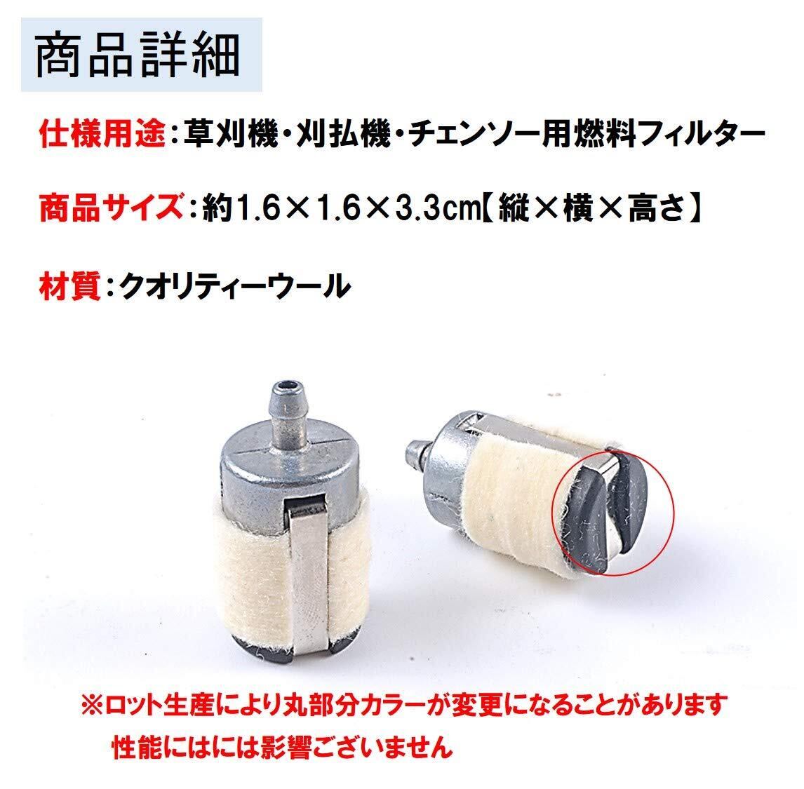 【商品詳細】仕様用途:草刈機・刈払機・チェンソー用燃料フィルター:商品サイズ:約1.6×1.6×3.3cm【縦×横×高さ】材質:クオリティーウール