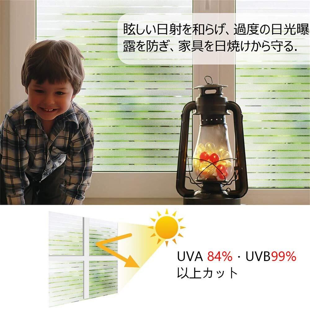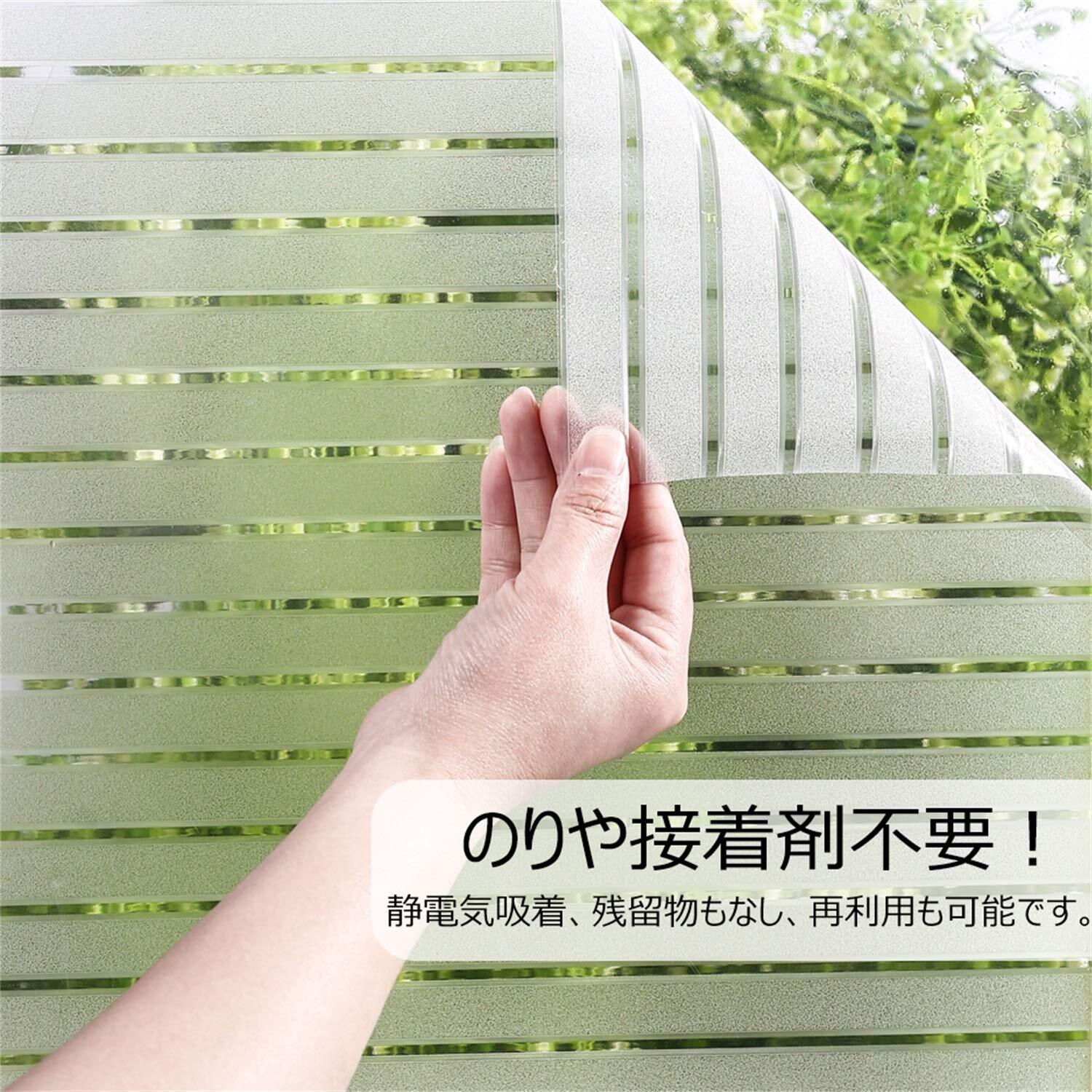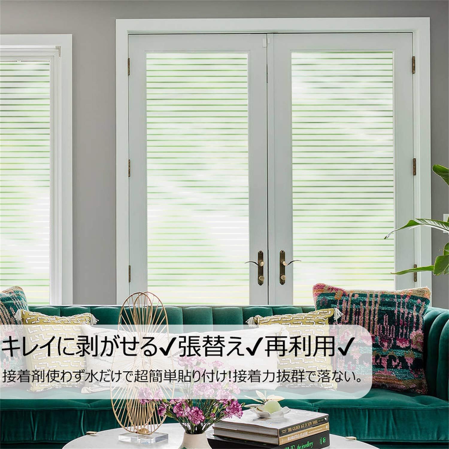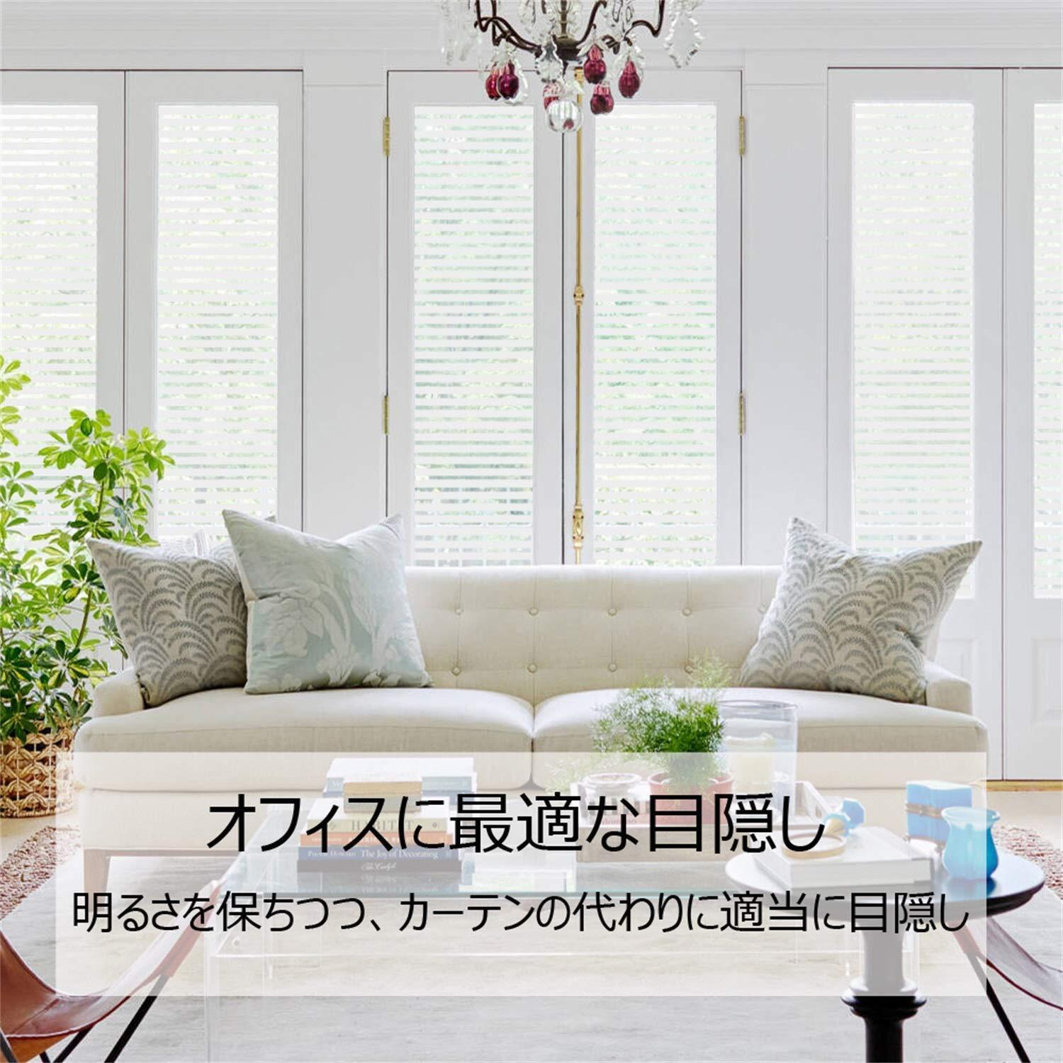 目隠し、プライバシー保護:20cm以上離れていれば、天気や昼夜を問わず、室内が見えにくいです。ストライプの隙間は半透明で、市販のストライプ柄フィルムより目隠し効果が向上!外からの視線を遮りながら、かつ、充分に外の光を室内に取り込めます。カーテンを閉めているときの閉塞感や窮屈感あるの暗い部屋から解放されるでしょう。貼り付けは簡単で、何分間だけ透明窓ガラスを上品な装飾ガラスに変身させ