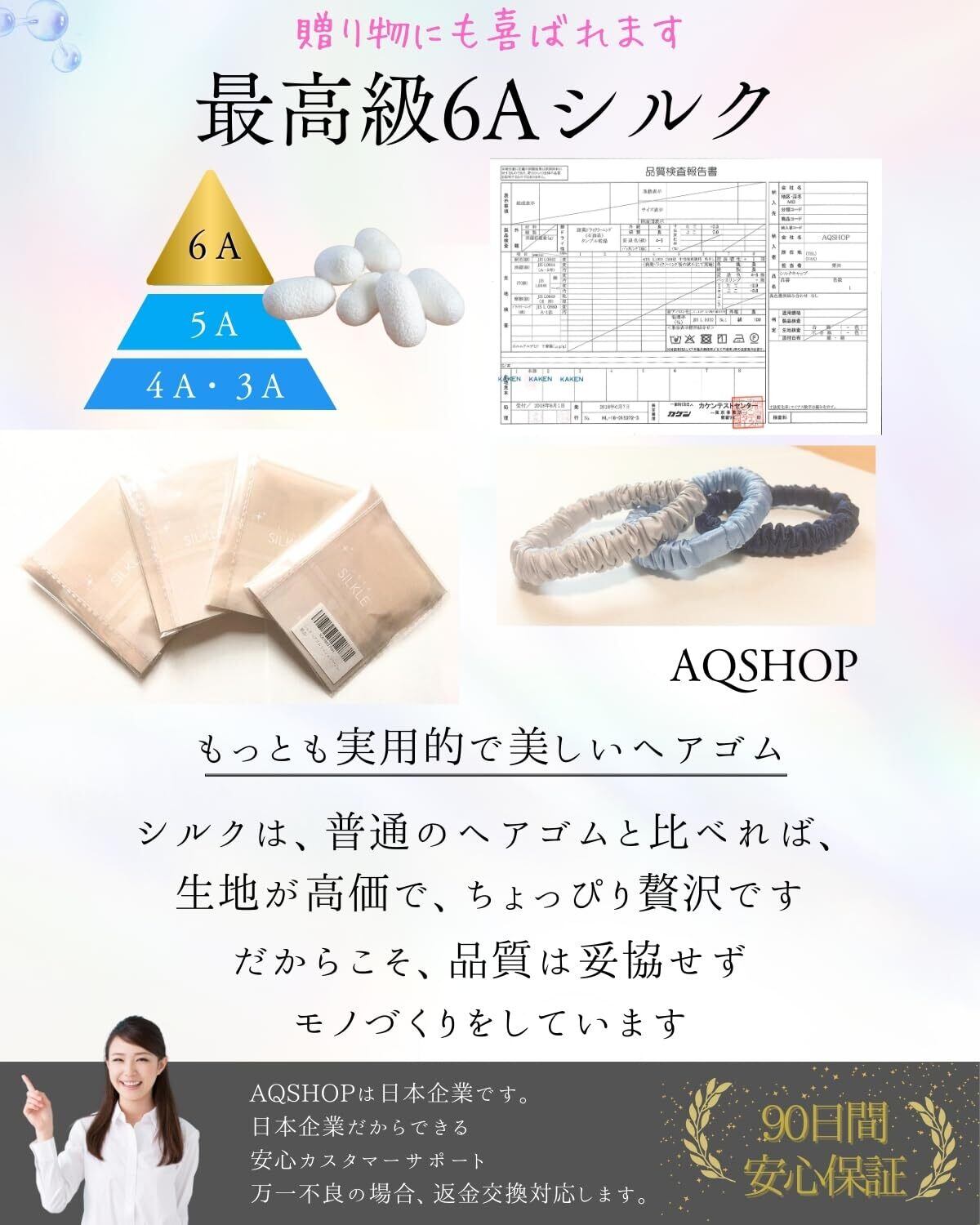 【90日メーカー保証】シルクヘアゴム 3個セット 幅1cm 素材シルク100% (内部のゴムは除く)、AQSHOPメーカー90日保証付き。やぶけ、ほつれ等、万一、不良があった場合も安心。返金対応いたします。