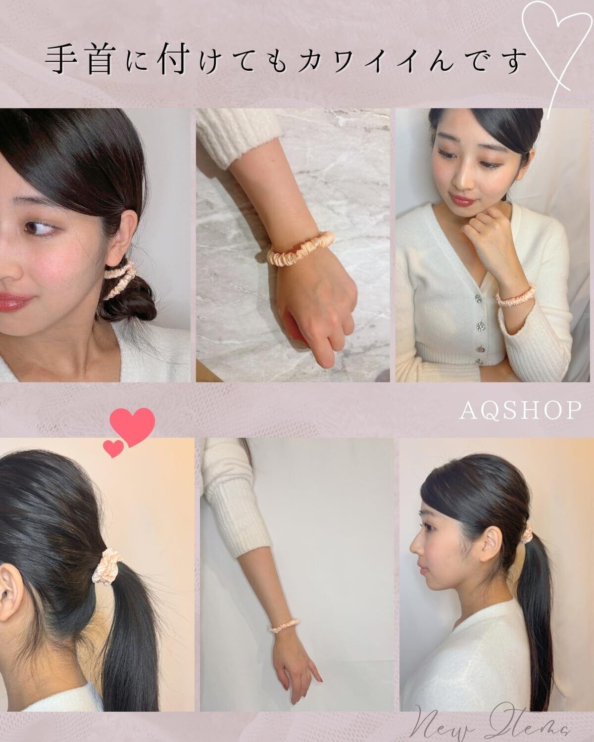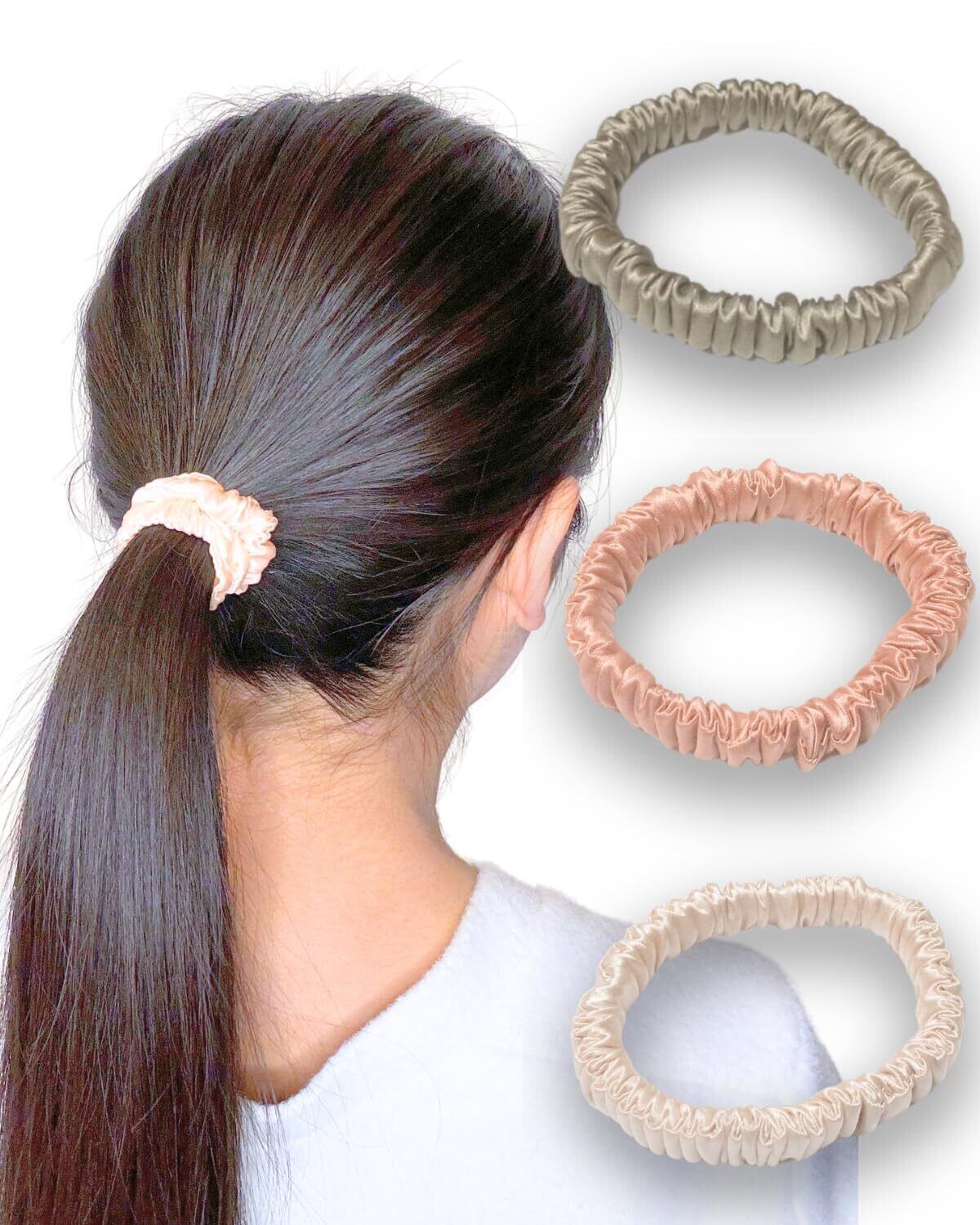 【髪を傷めないシルクのヘアゴム】付け外しの際に、髪が絡まないので髪を傷めません。また、付けている際も締め付け過ぎないので、擦れ、締め付け、圧迫などで髪や頭皮を傷めにくいです。二重に巻いて髪を留めるのにちょうどよい長さです。