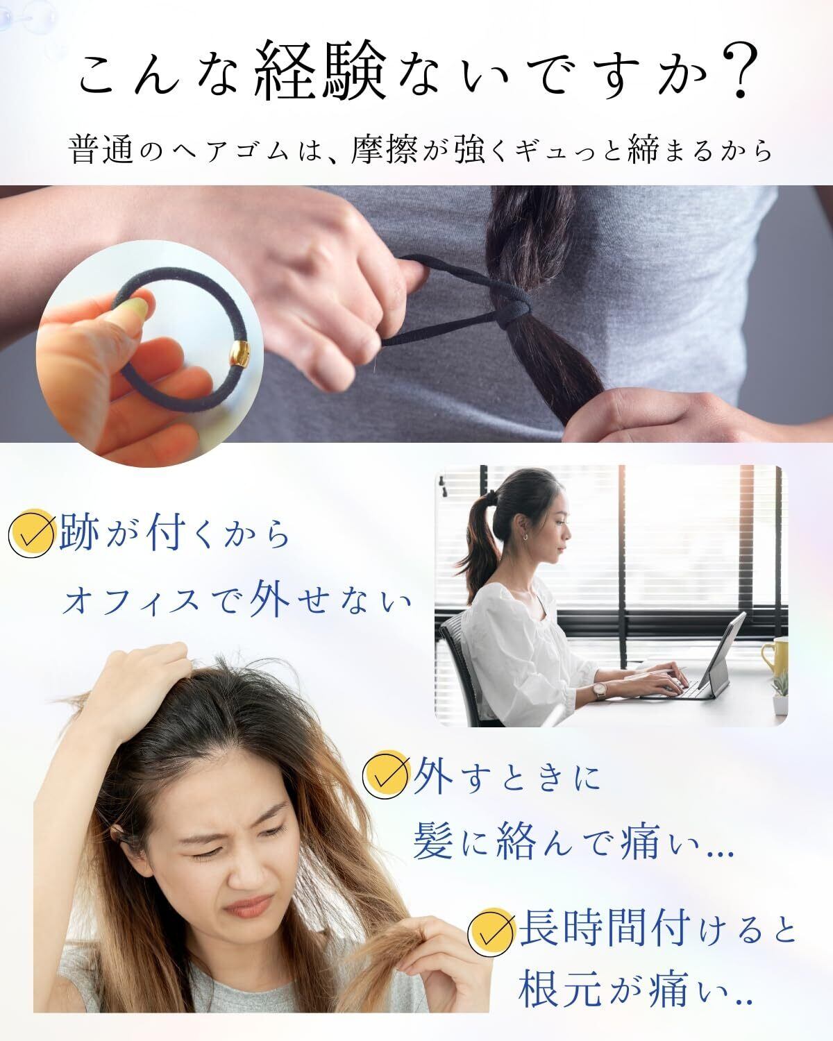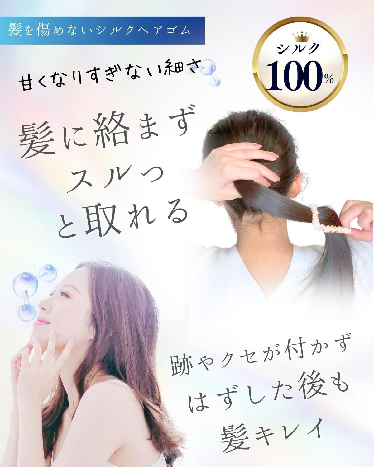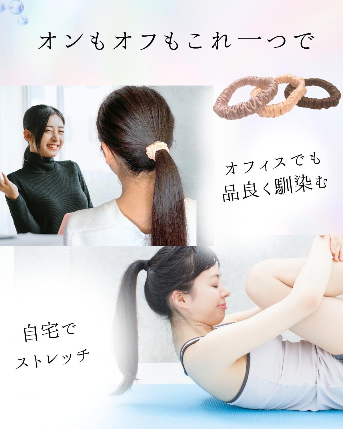 【結び跡がつきにくい】シルクは、なめらかな質感で、外した後も、結び跡が付きにくい。外した後のヘアスタイルの乱れを気にせず、職場や学校でも使用できます。