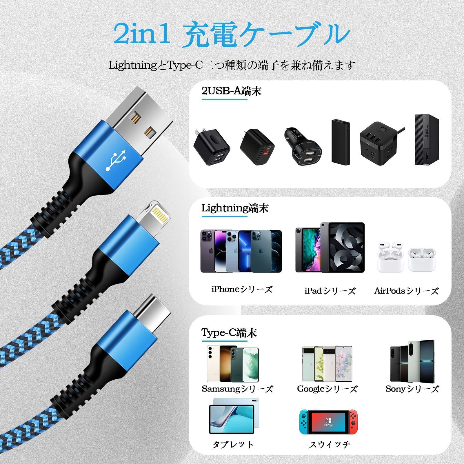 【数量限定】2in1 iPhone 充電ケーブル 「2本組/1.2M」タイプc USBケーブル ライトニングケーブル 2.4A&3A急速充電 Haoano マルチコネクタケーブル 2イン1 充電コード 2台同時給電可能 iPhone 16 Pro Max/15/14 Pro Max/13//12/SE/iPad Air/iPad Mini/Galaxy S23/S22/Google Pixel (青+紫) | ニコニコSHOP