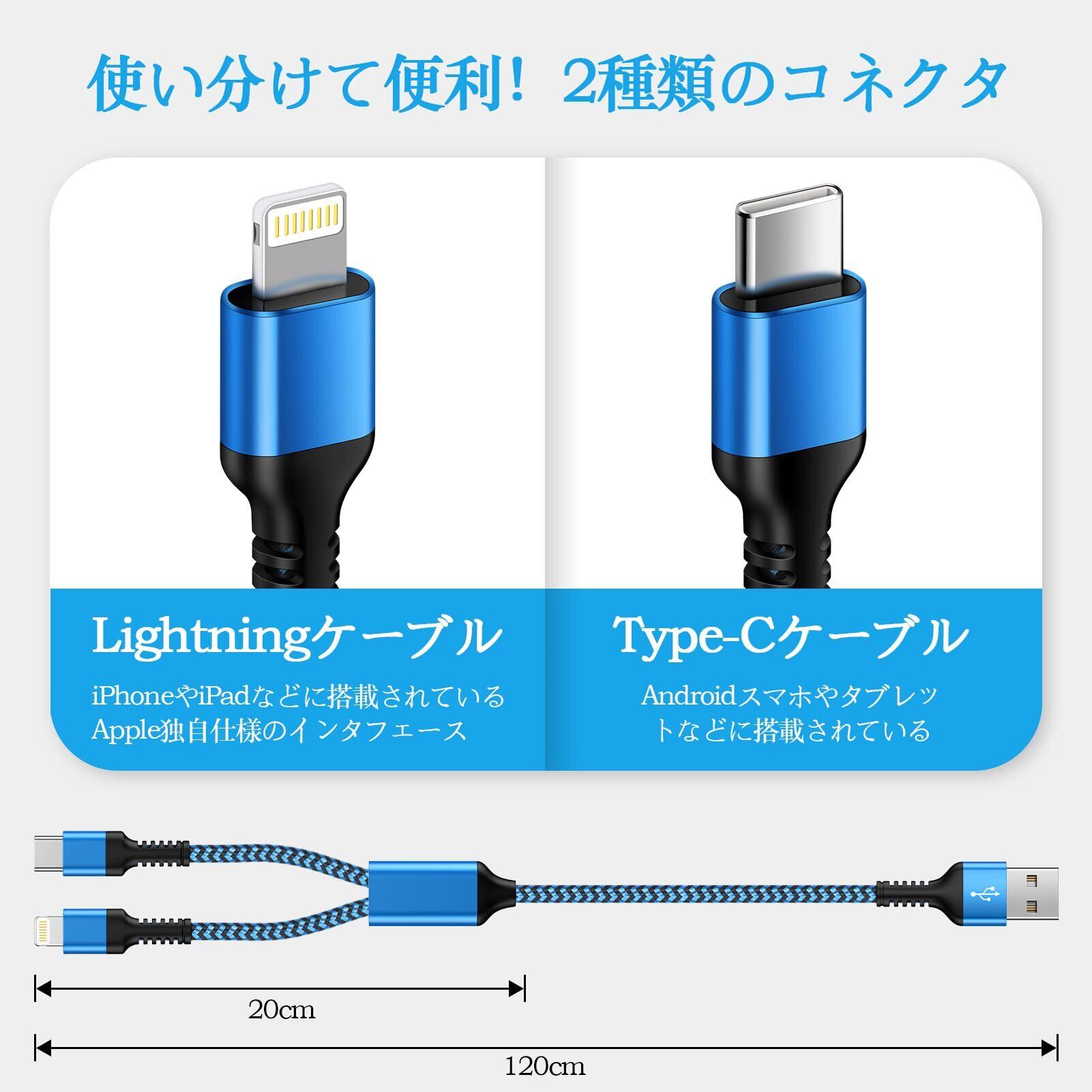 【1本2役】本製品はType-Cとライトニング接続端子を1本の高品質なケーブルにまとめまして、2台のデバイスが同時に急速充電できます。家族、旅行、仕事、出張、さらには車の後部座席でも電子デバイスを充電するのに最適です。(ご注意:製造時期によりケーブル接続部のカラーに若干の違いがある場合がございます。予めご了承の上お買い求めください。)