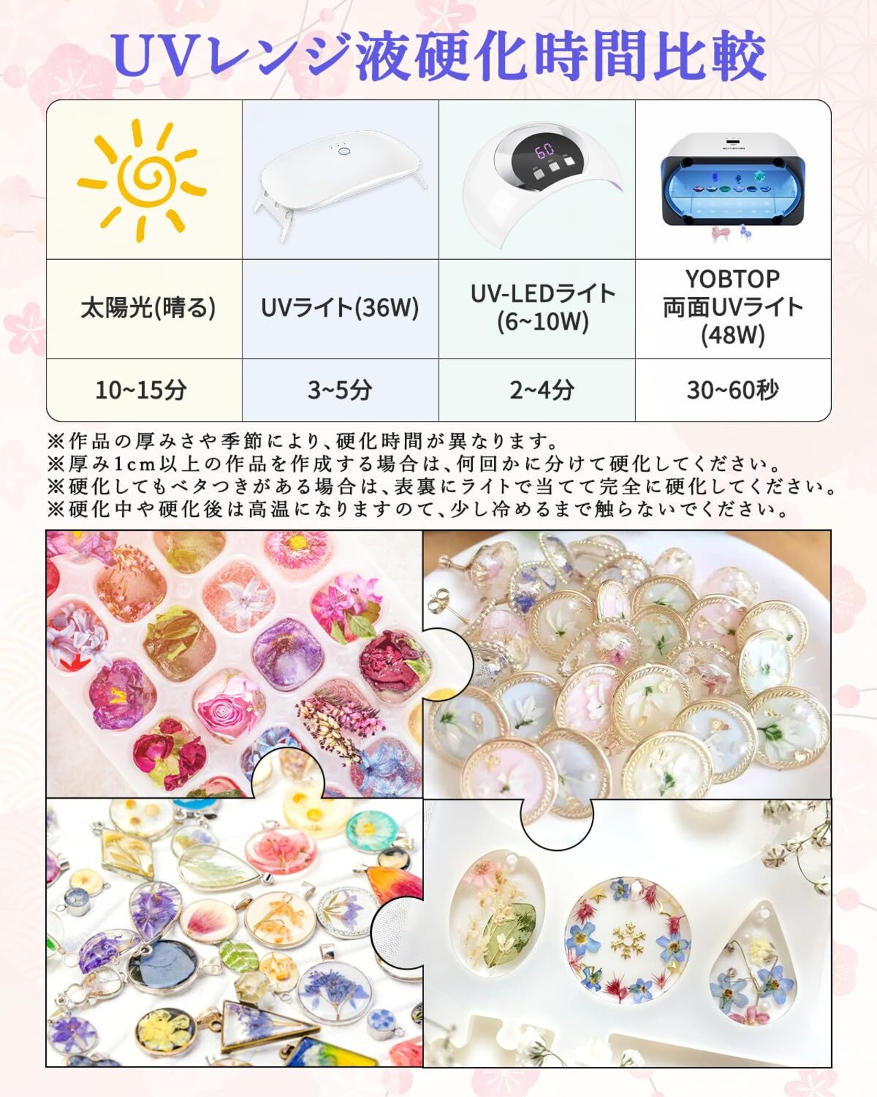 【UV-LEDランプ対応 & 超速硬化】UVレジン液はUVランプやUV-LEDランプで硬化できます。特殊配合により、硬化に要する時間が非常に短い。硬化後のべたつきが少ないので、すぐに次の工程に移れるのが特徴です。初心者からプロまで、効率的な作業が可能です。
