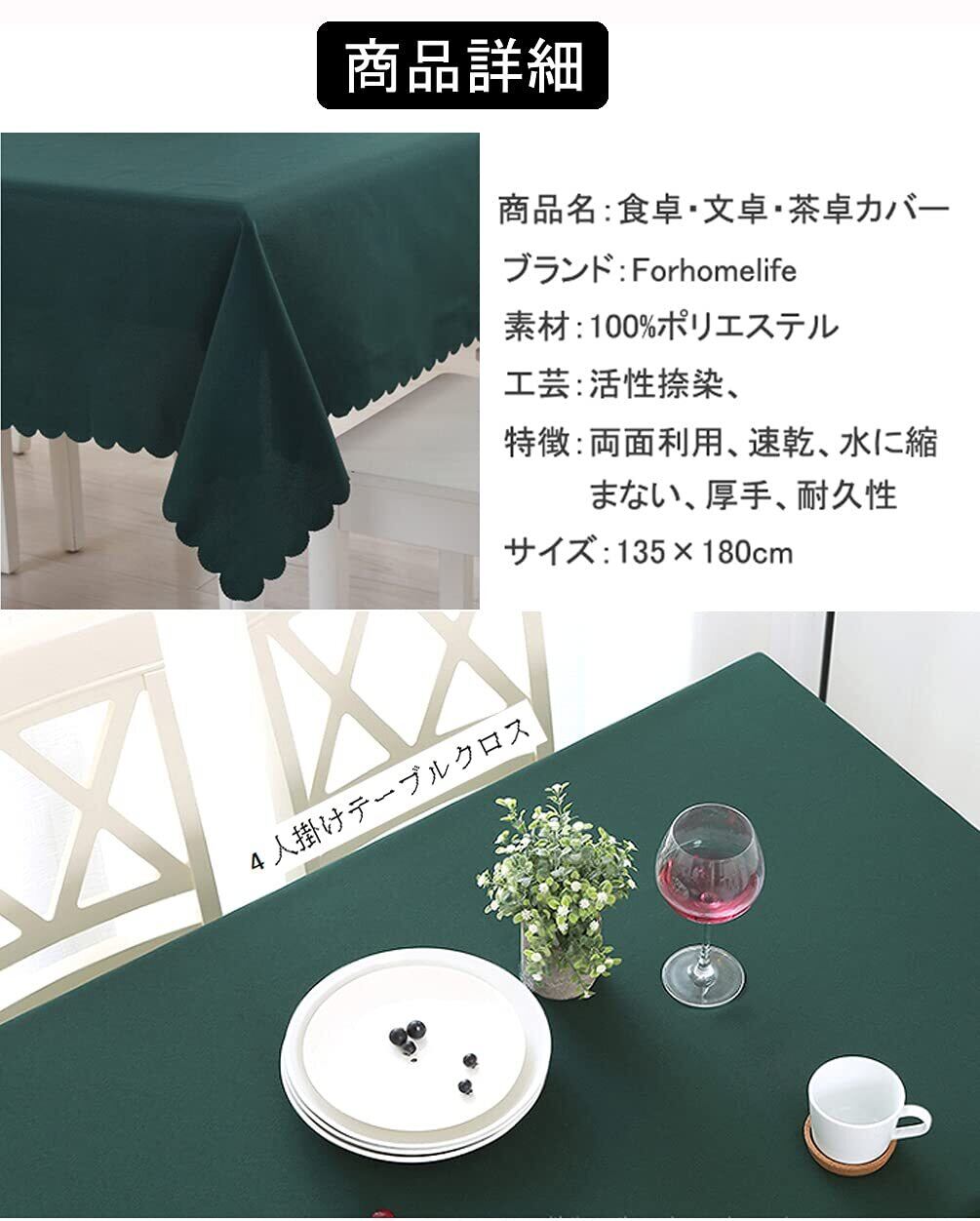 Forhomelife テーブルクロス クリスマス グリーン 無地 シンプル 長方形 135×180cm 洗える ウォッシャブル 洗濯可 速乾 緑 厚手 耐熱