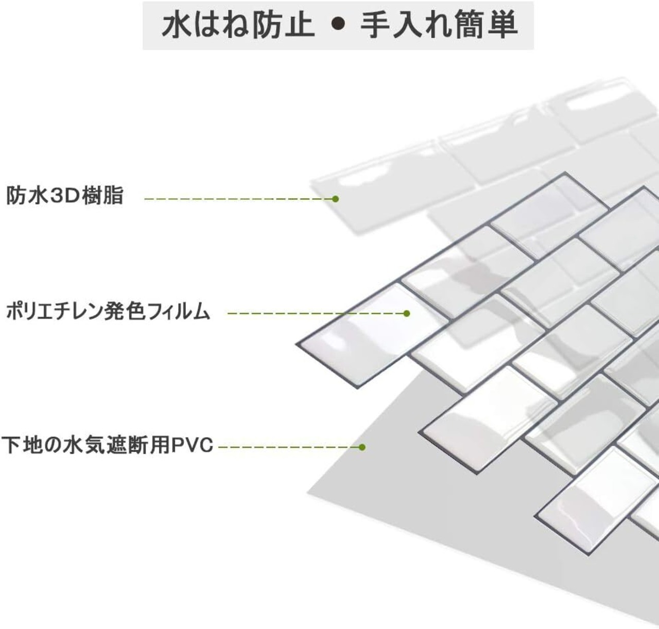 防水&耐熱&防汚:耐熱120℃、油汚れ防止、100%防水のシールなので、キッチン、トイレ、洗面所や浴室などの壁にも安心に使えます。タイルシール防水の底部はアルミ箔材料を採用するので、より頑丈になり、しわが出にくい、長くしっかりと貼り付けることができます。