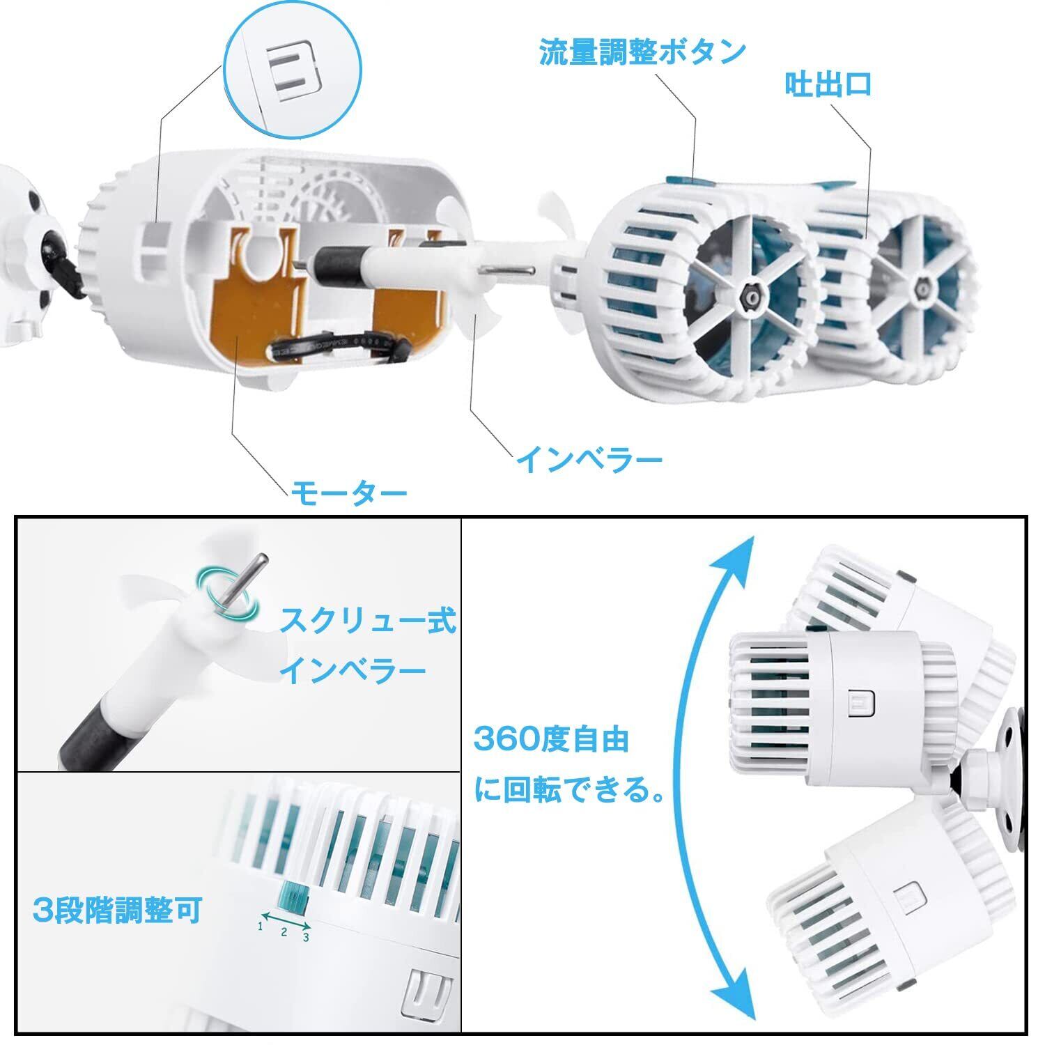 【流量調整&回転可能&二重出口】流量調整機能が付いています。流量調整ノブで三段階流量を調整できます。二つの出口は、それぞれの出口で流量の大きさを制御できます。ご使用の場面によって適当な流量を選べます。362°回転ができます、ご必要の方向で水流の方向は調整可能です。水槽内で自然界の水中のような水流を実現できます。