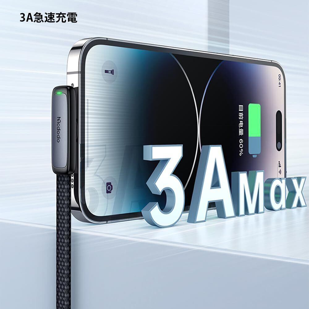 【在庫セール】Mcdodo L字型 90度曲げ USB to ライトニングケーブル 1.8m 高耐久 断線防止 ナイロン編み LED表示ライト付き 3A急速充電 高速データ転送 iPhone/iPad/iPod 対応 (ブラック, IOS 対応) | ニコニコSHOP