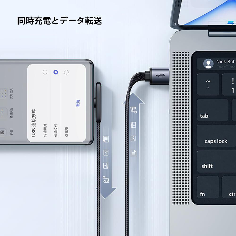 同時充電とデータ転送:このケーブルは充電とデータ転送を同時に行えます。データ転送速度は最大480Mbpsで、高速かつ安定したデータ転送を実現します。また、新しい横向きのコネクタ設計により、ケーブルの損傷や外観の損傷を大幅に減少させ、安心して使用できます。