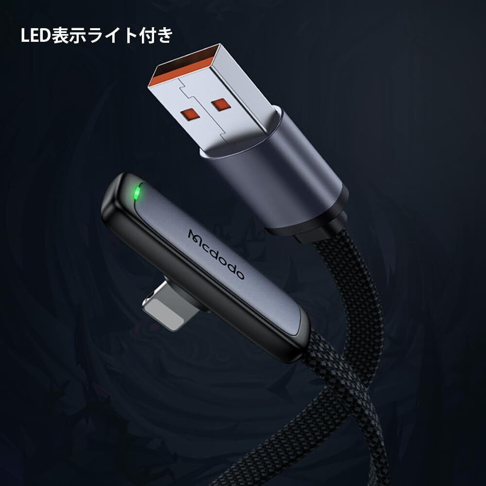 Mcdodo L字型 90度曲げ USB to ライトニングケーブル 1.8m 高耐久 断線防止 ナイロン編み LED表示ライト付き 3A急速充電 高速データ転送 iPhone/iPad/iPod 対応 (ブラック, IOS 対応)
