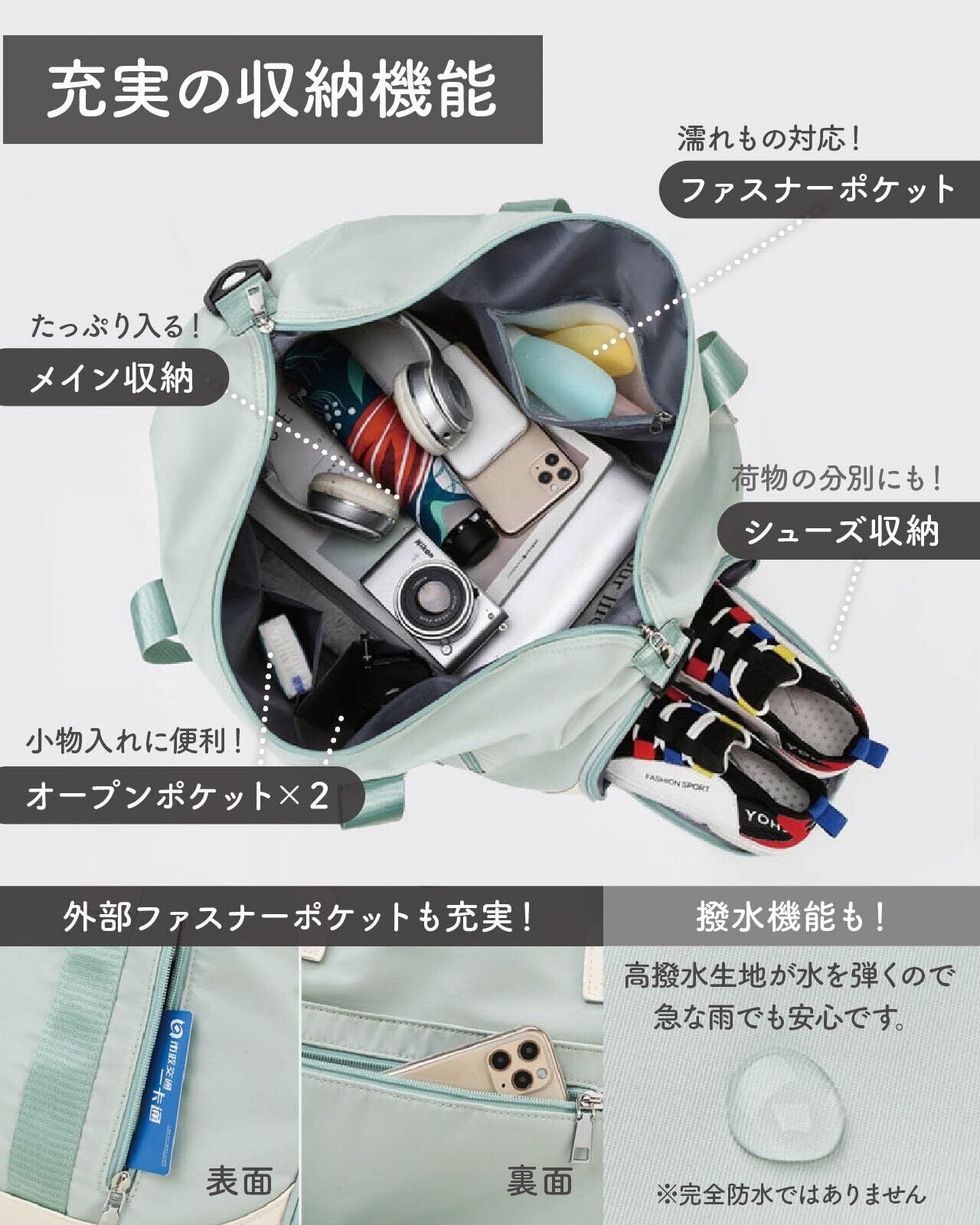 【収納機能】 メイン収納部の中には、ファスナーポケットと2つのオープンポケットを設置。ファスナーポケットは乾湿分離仕様で浸水しない為、濡れたタオルや洗面用品を入れるのにも最適です。バッグの外側にもファスナーポケットが2つ付いていますので、バッグを開けずに小物の収納をする際にも便利です。またバッグの側面には透気孔付きシューズ収納があり、靴の持ち運びや荷物の種類を分けたい時にも活躍します。